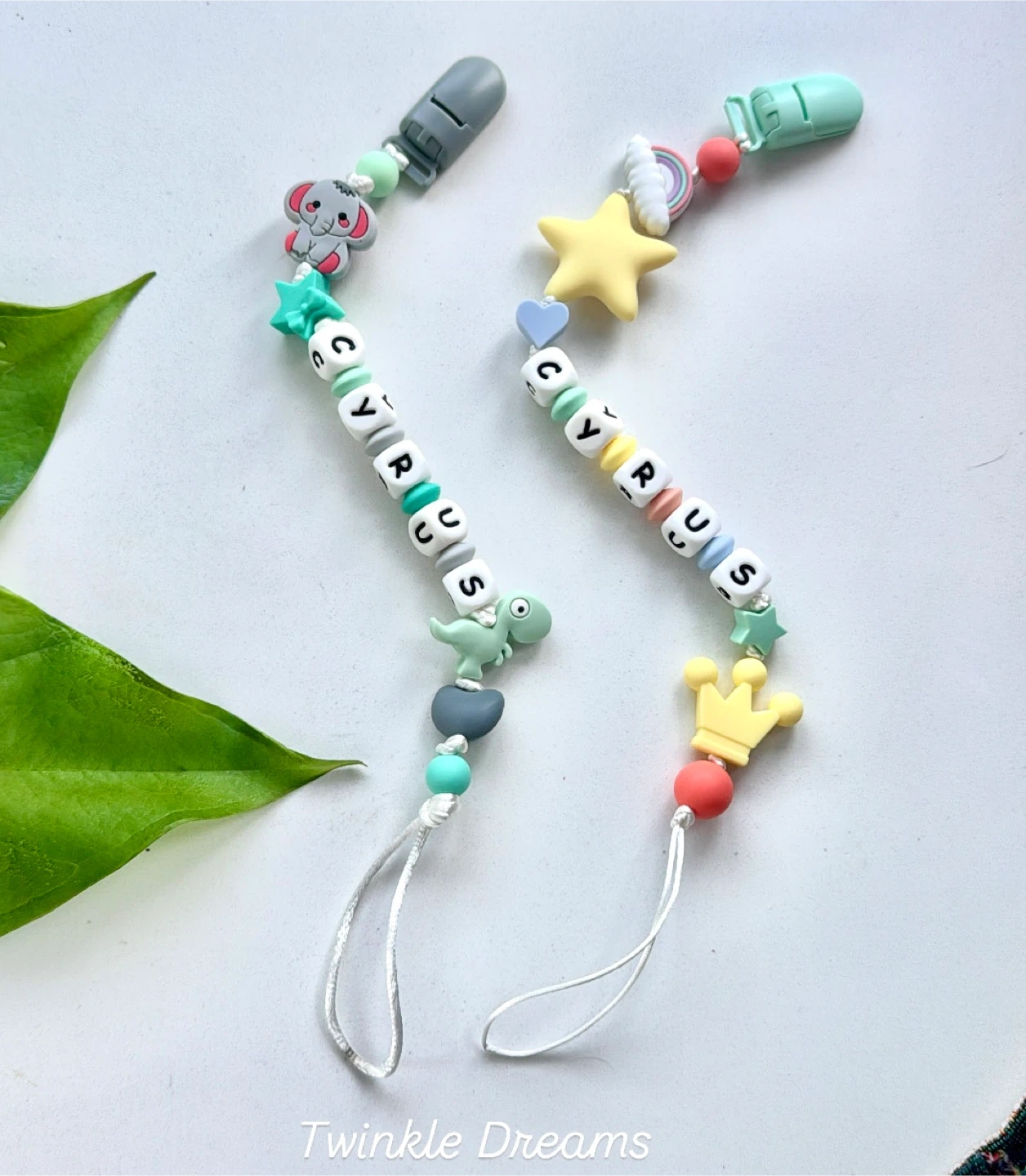 11Check out this adorable custom pacifier clip from Twinkle Dreams! It spells out the name 'Bianca' with cute colourful beads and features a unicorn charm. Perfect for keeping your little one's pacifier clean and close by