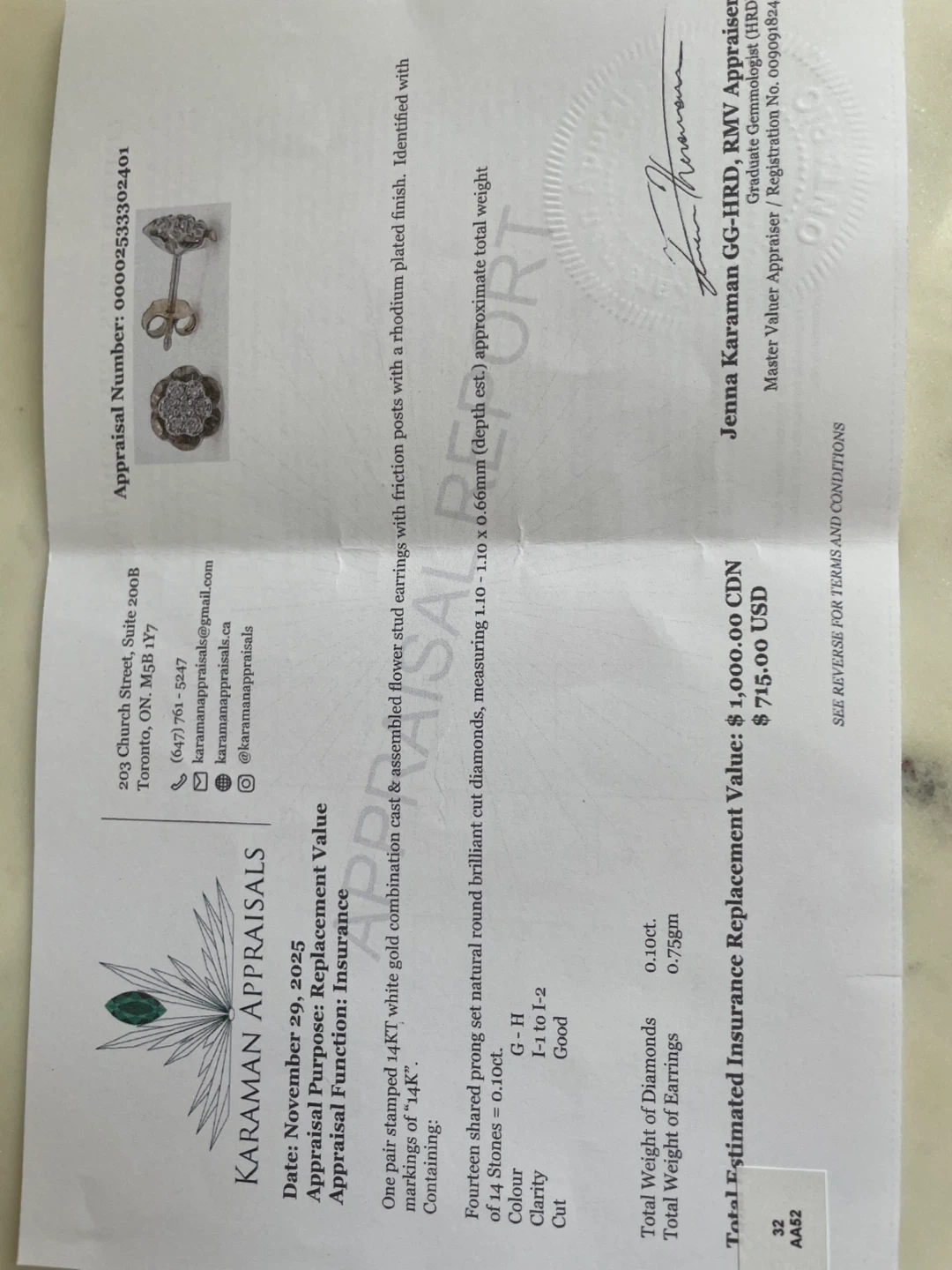 14k White Gold Natural Diamond earrings- Appraisal included