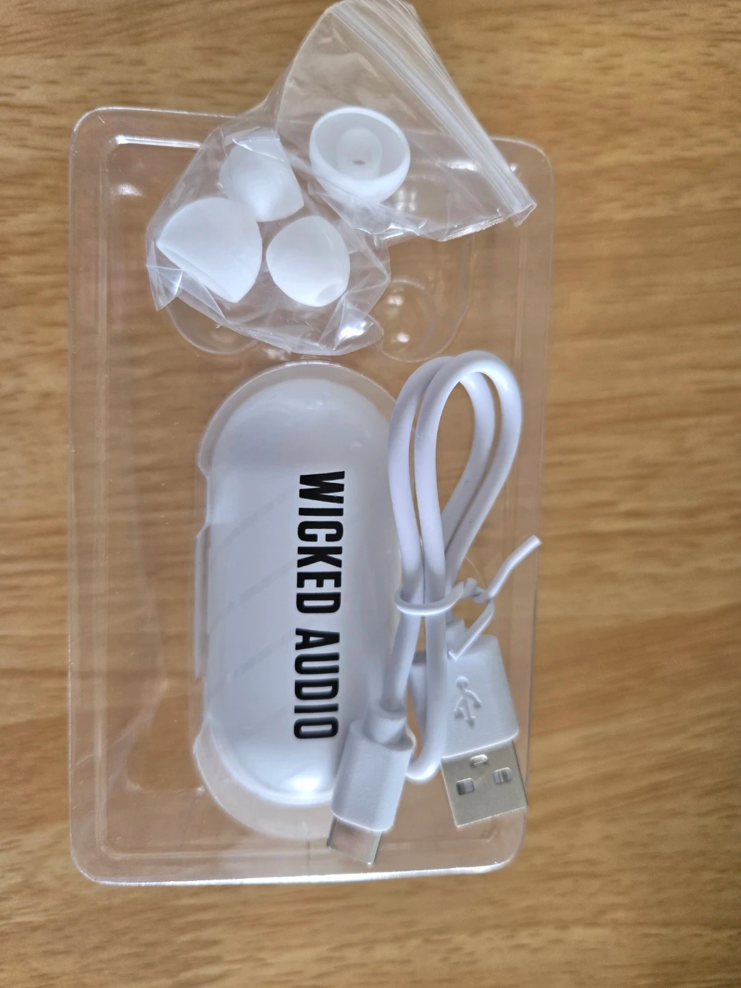 These Wicked Audio EMBR earbuds offer up to 26 hours of total playtime. They feature true wireless connectivity with easy pairing and noise isolation. The package includes the portable charging case, USB-C charging cable, and three sizes of cushions.