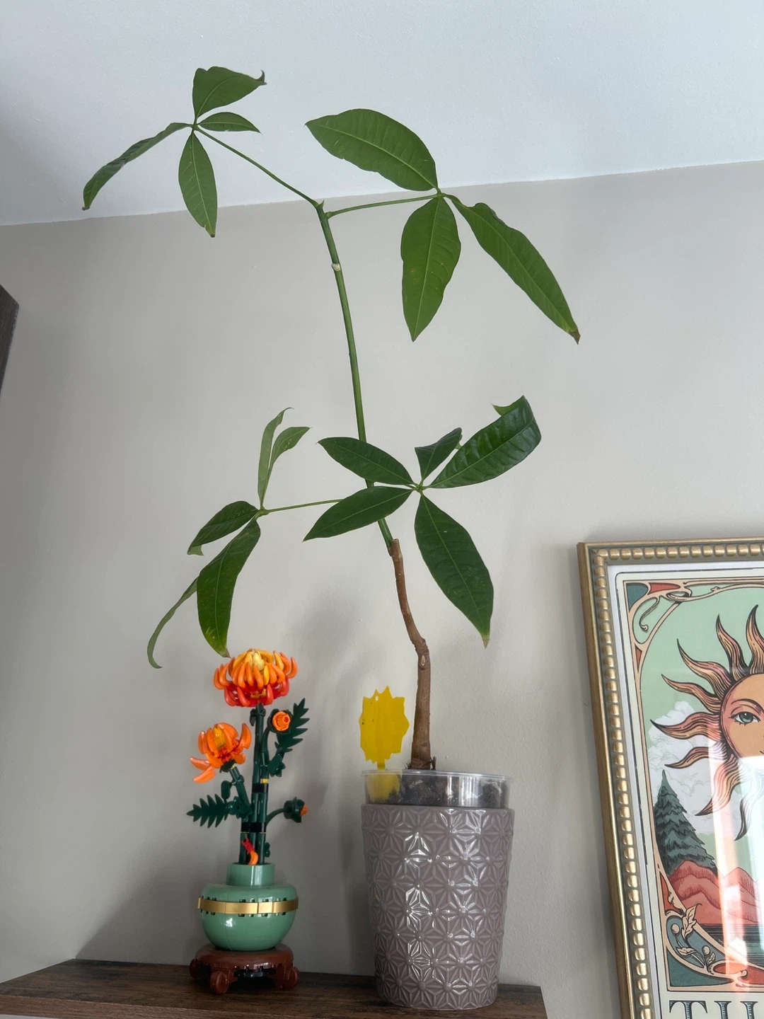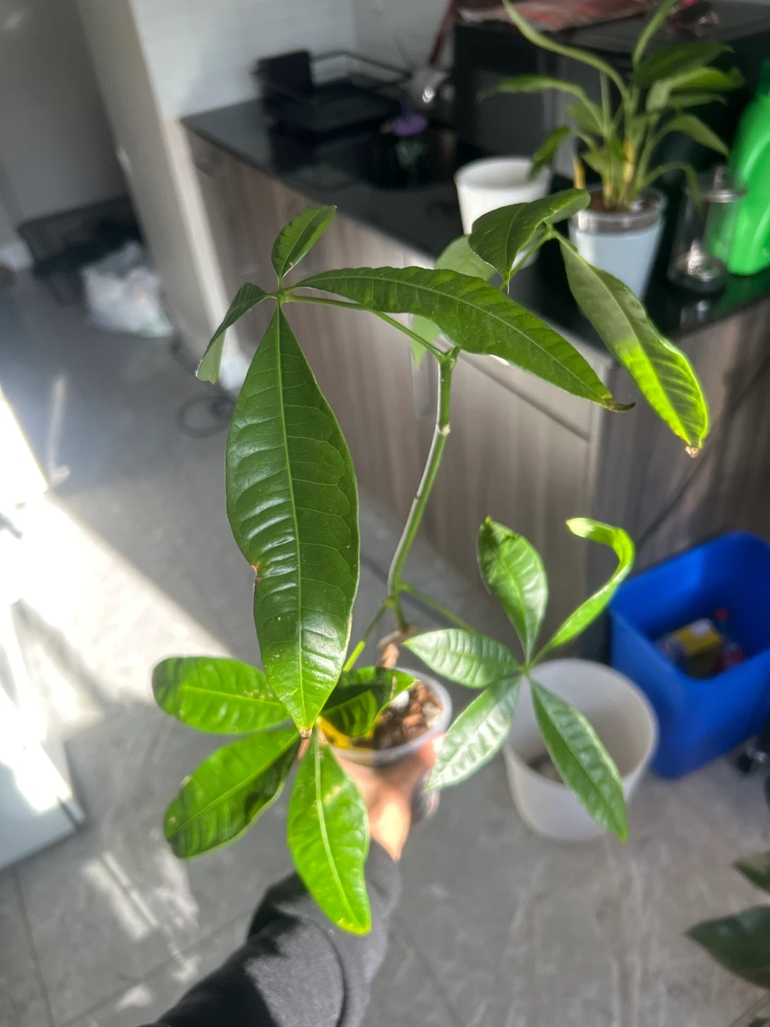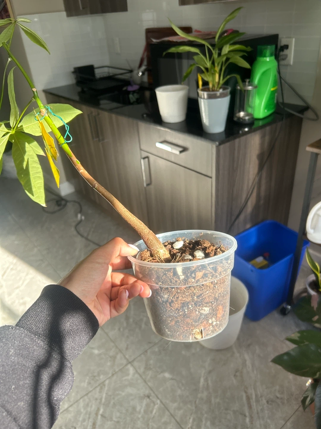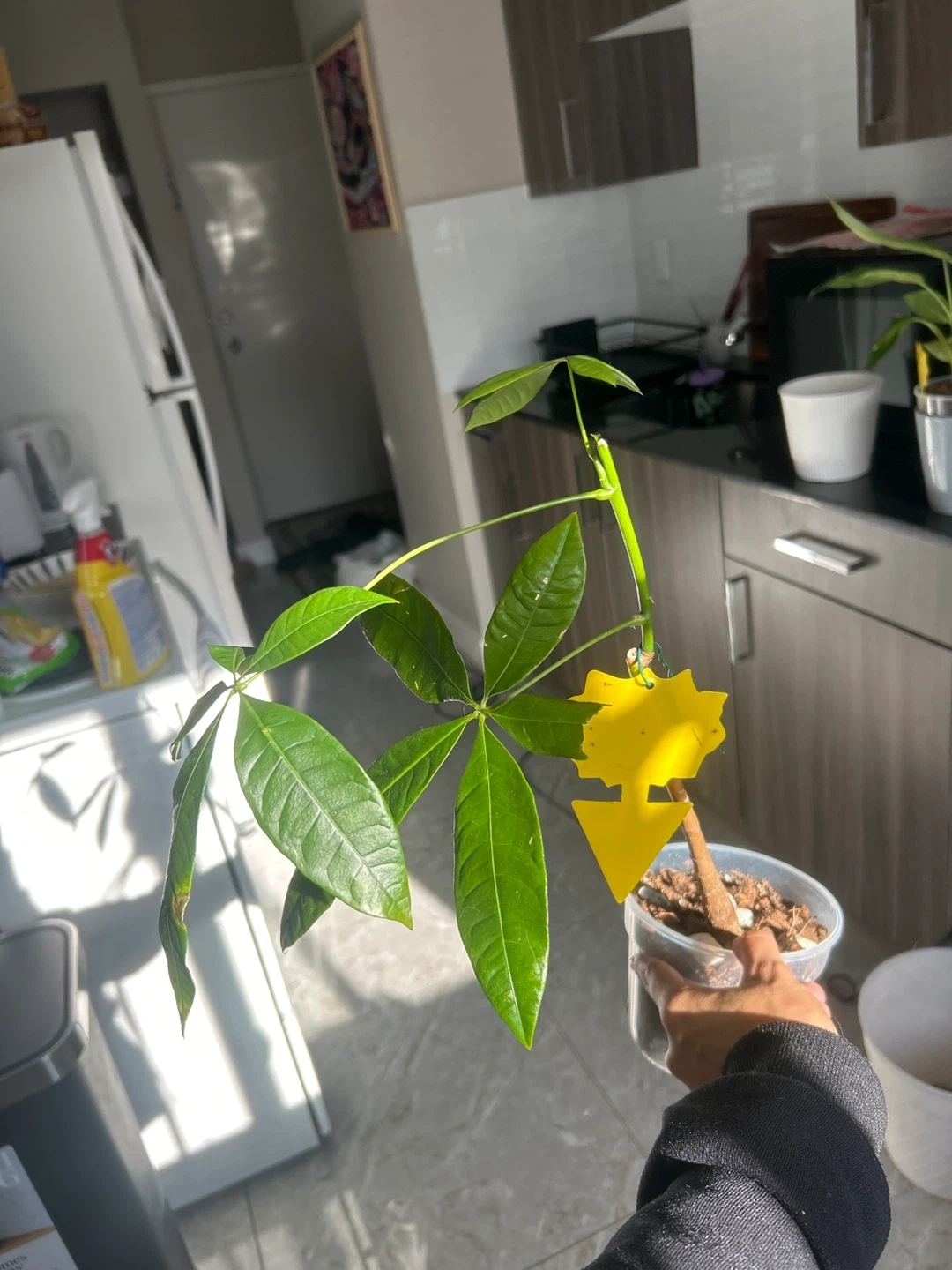 Money Tree plant. Potted in a clear plastic container with well-draining soil. Ready to be repotted or placed in a decorative planter. Separated