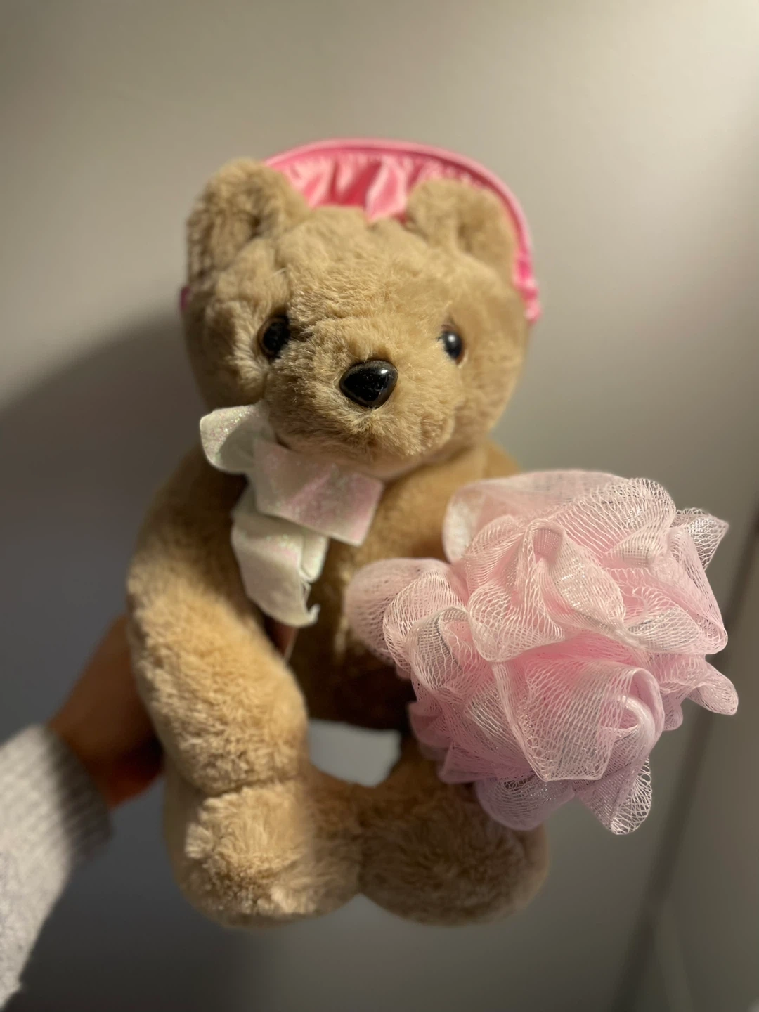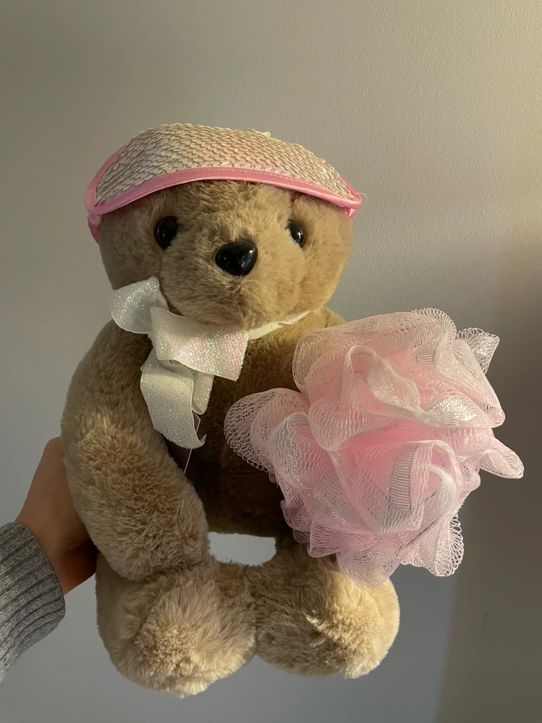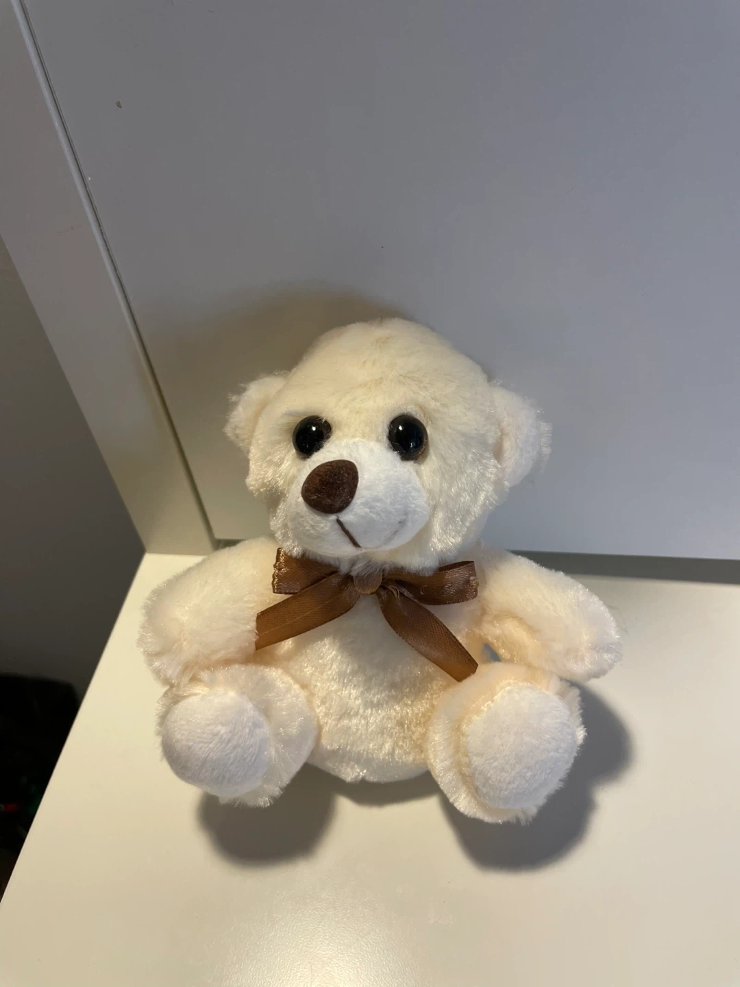 Selling these adorable teddy bear plush toys! They're in great condition and ready to be loved by someone new. The brown teddy bear has a cute pink hat and bow, while the white one has a lovely brown bow. Perfect for kids or anyone who loves cuddly toys.