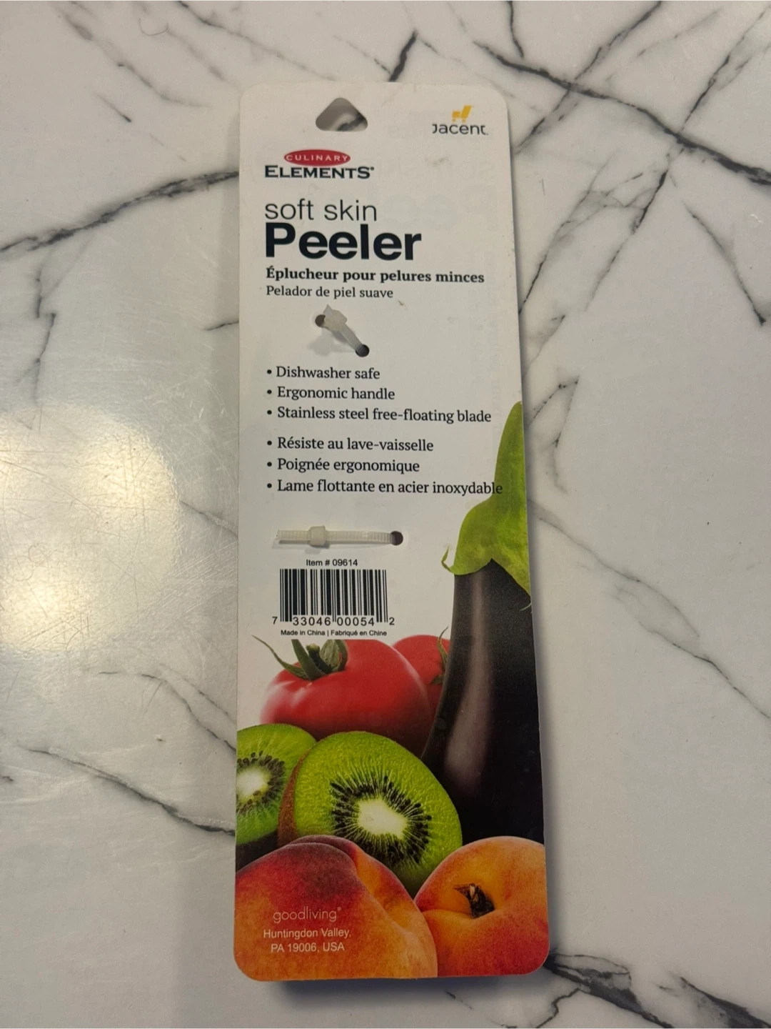 This soft skin peeler features a red ergonomic handle and a stainless steel free-floating blade. It's dishwasher safe for easy cleaning. This peeler is handy for preparing fruits and vegetables.