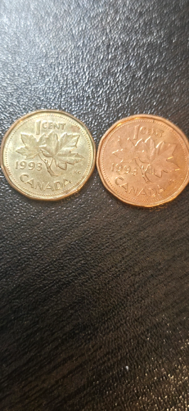 Selling two Canadian one cent coins from 1993. Both feature the maple leaf design. One coin is a lighter colour than the other.