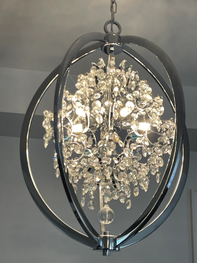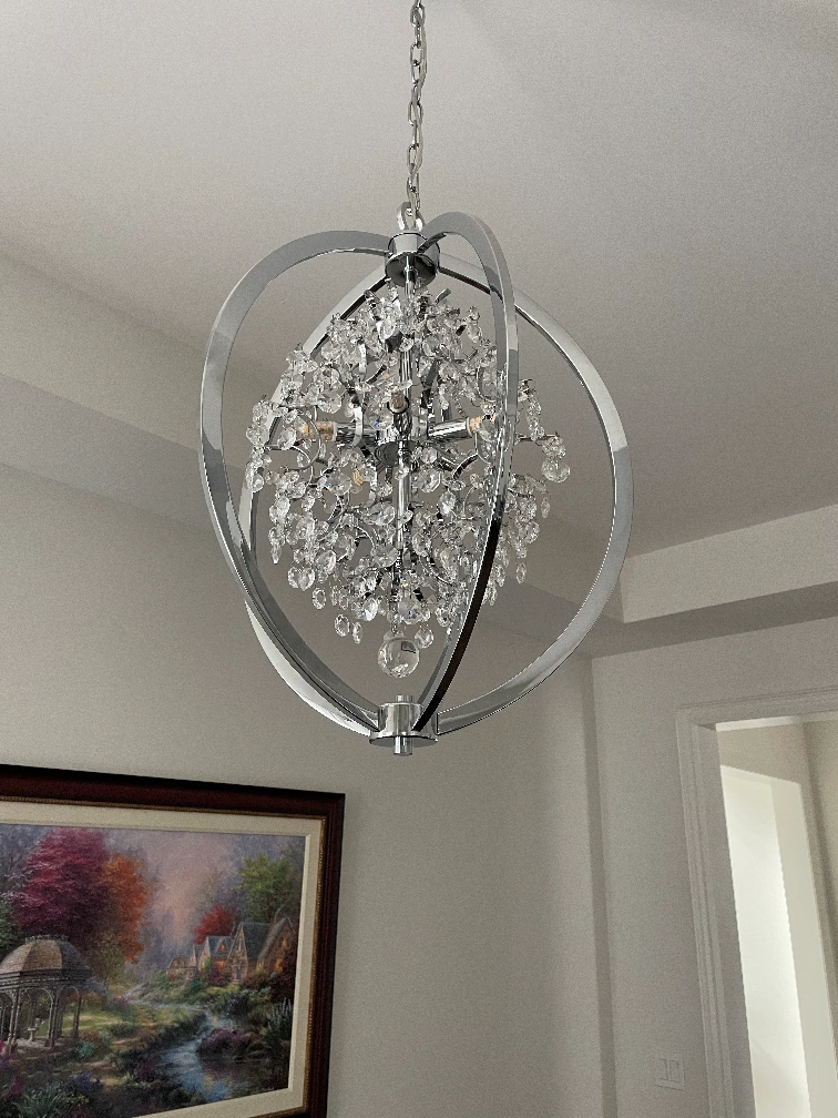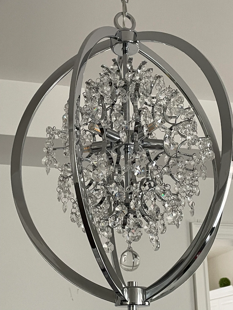 I have two chrome crystal chandeliers. Features a crystal globe design. Elegant and modern. Perfect for dining room or living room. No longer needed as we installed pot lights. Originally bought them for $350 each. $150 for one. $280 for both. Pick-up only. Cash preferred.