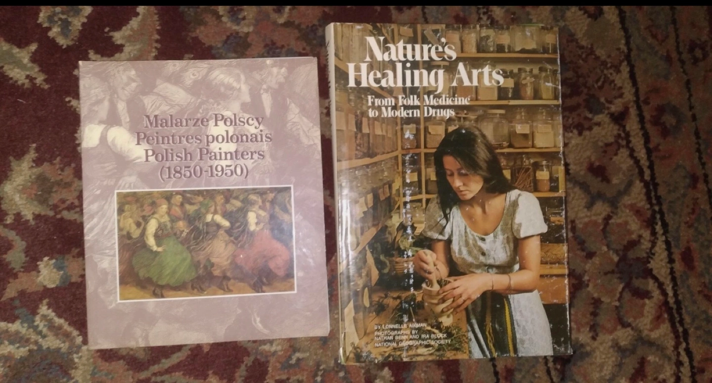 4$ for both. Selling two books together. One is 'Malarze Polscy Peintres polonais Polish Painters (1850-1950)' and the other is 'Nature's Healing Arts: From Folk Medicine to Modern Drugs' by Lonnelle Aikman with photographs by Nathan Benn and Ira Block from the National Geographic Society