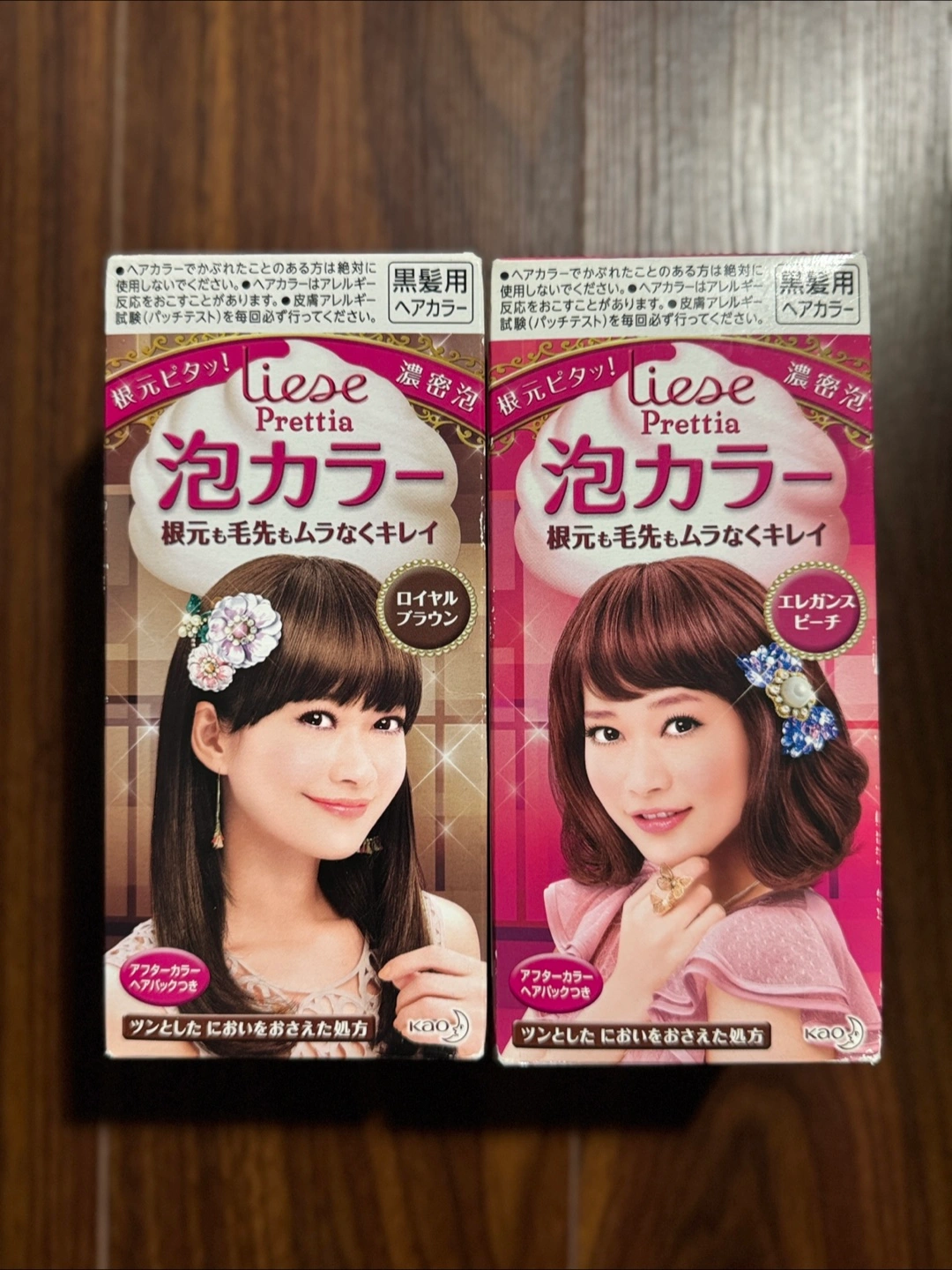 77Two boxes of Kao Liese Prettia bubble hair dye. One is Royal Brown, the other is Elegance Peach. New, unopened boxes. Japanese instructions.