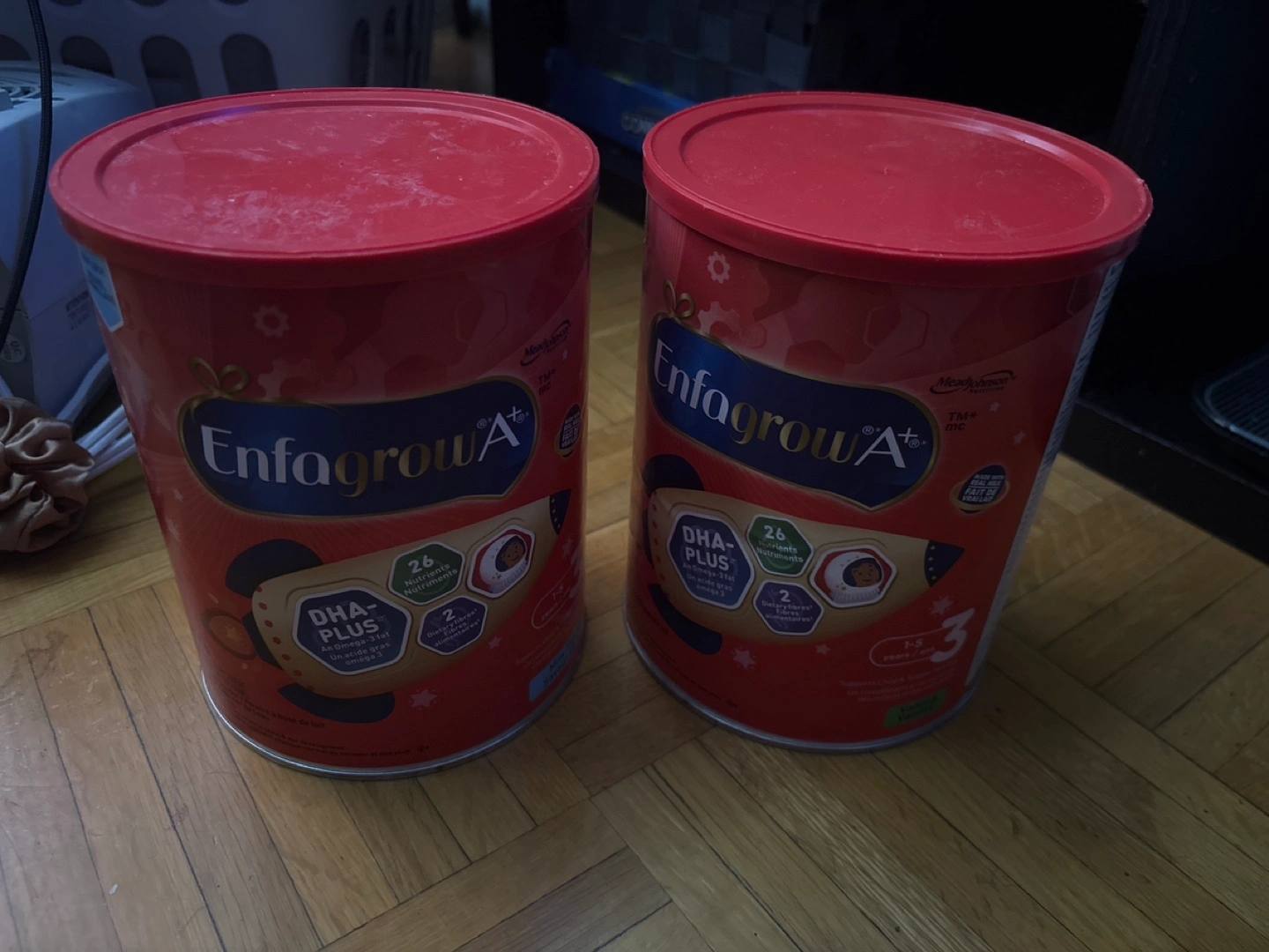 Two unopened cans of Enfagrow A+ toddler formula. Ages 1-3 years. DHA-Plus. 26 nutrients. 2 dietary fibres. One can for $25 or two for $40