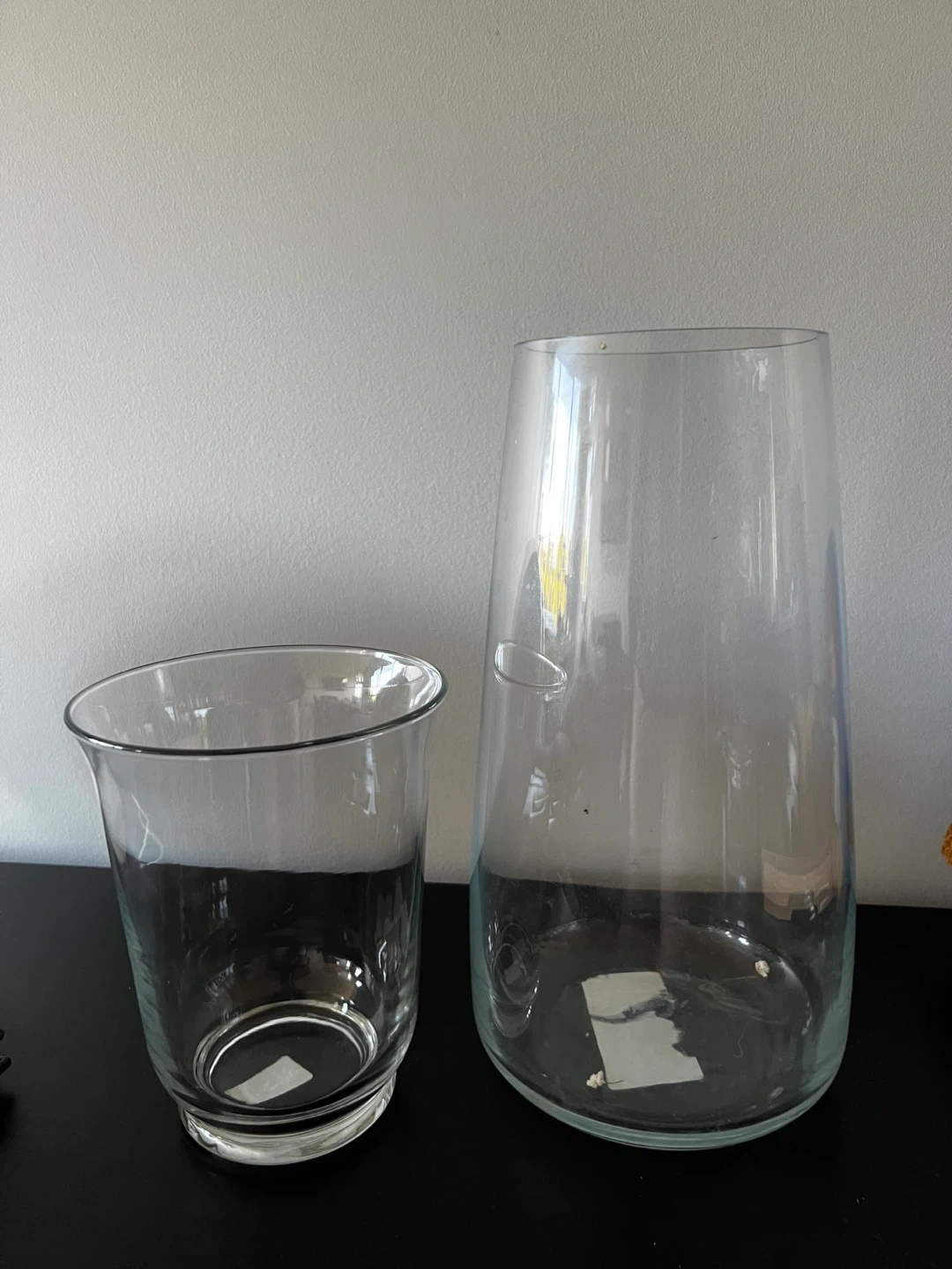 Selling two clear glass vases. They're perfect for displaying flowers or adding a decorative touch to any room. One is taller and more cylindrical, while the other is shorter and wider. Both are in great condition and ready to find a new home!