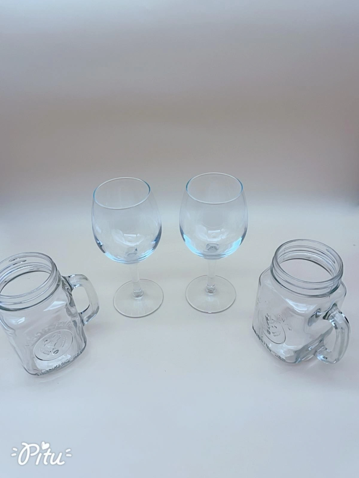 Two clear wine glasses with stems in the center, flanked by two glass mason jars with handles, all placed on a plain white surface. The setup contrasts elegant wine glasses with casual mason jars. 🍷