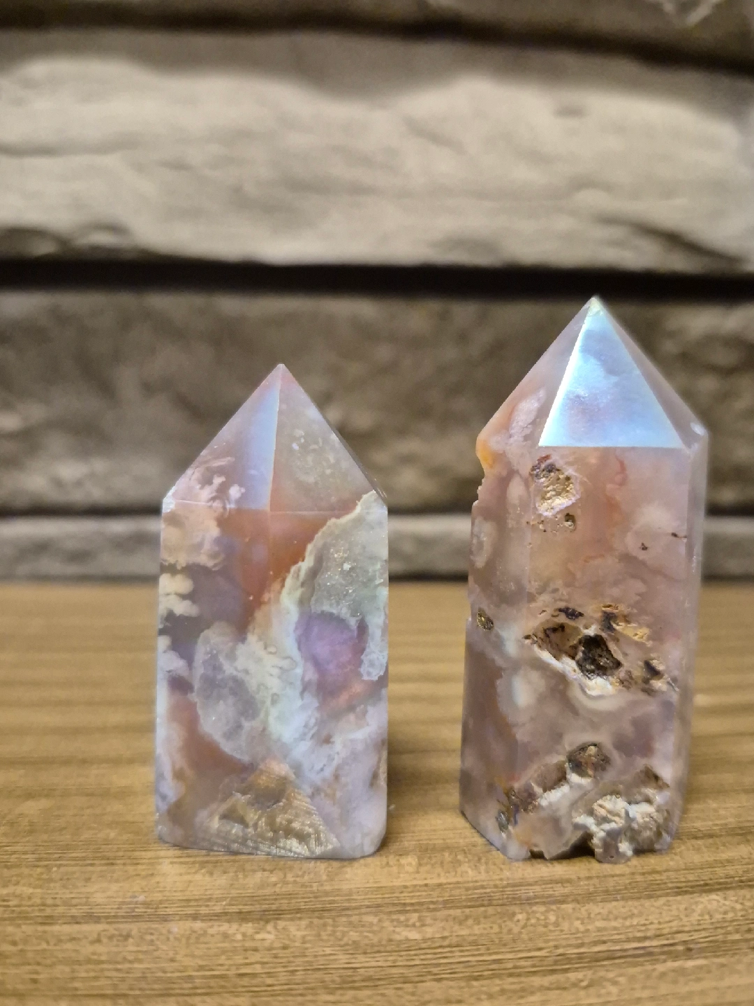 Selling two Cherry Blossom Agate Towers, also known as Flower Agate from Madagascar. Metaphysical Properties: Flower Agate is associated with emotional balance, growth, and manifesting dreams, often linked to the heart and root chakras.