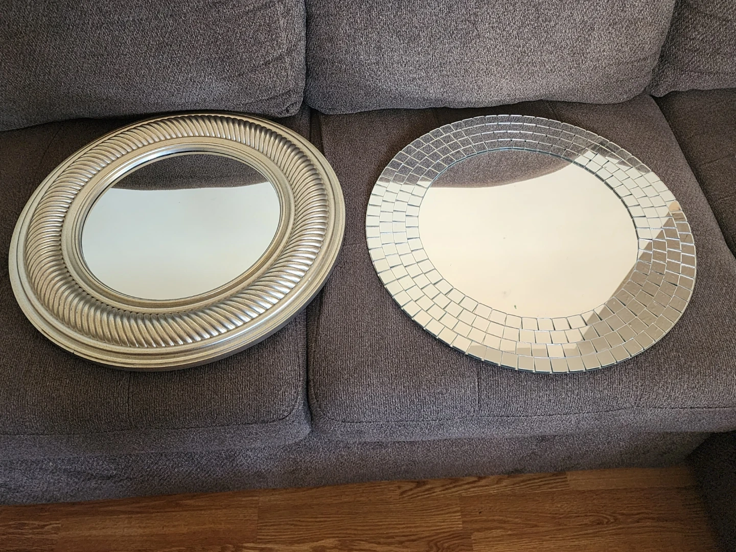 68Selling two decorative round mirrors. One has a silver frame with a rope design, and the other is covered in small mosaic-style mirror tiles. They would look great in any room!