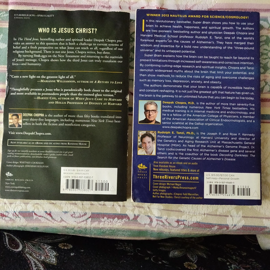 Paperback books by Deepak Chopra - The Third Jesus and Super Brain. Both books are New York Times Bestsellers. Includes a small sticker on the back cover of The Third Jesus. Comes from smoke-free pet-free home. Pickup only. Cash only.
