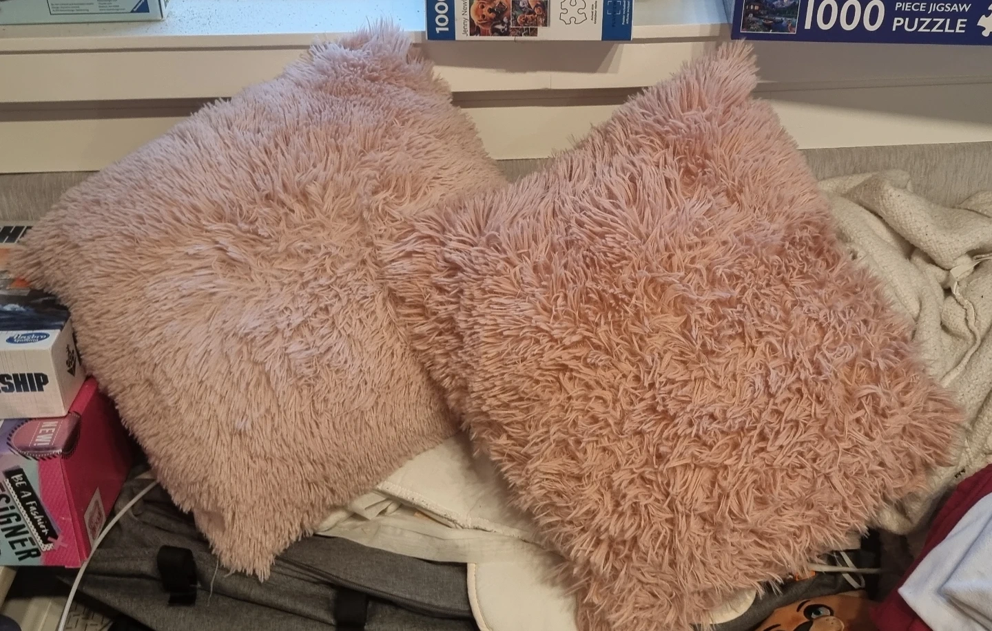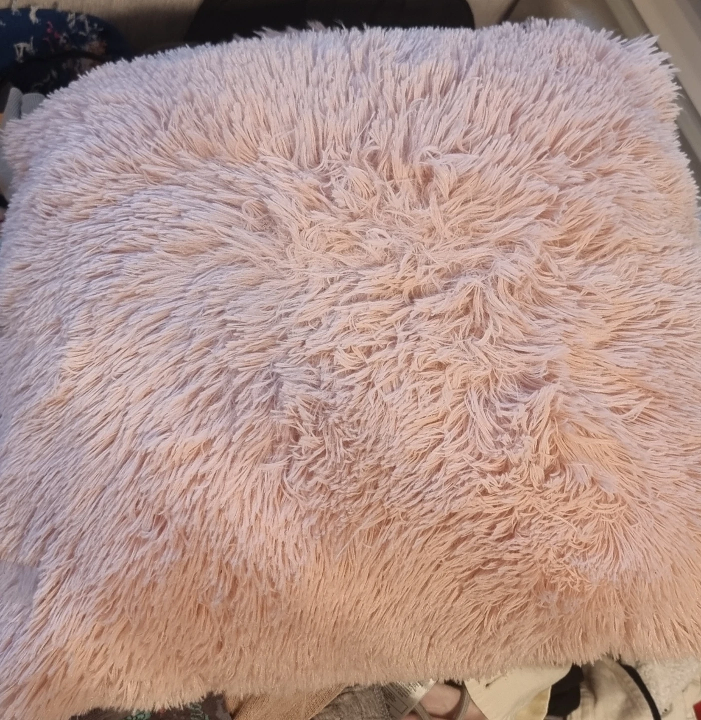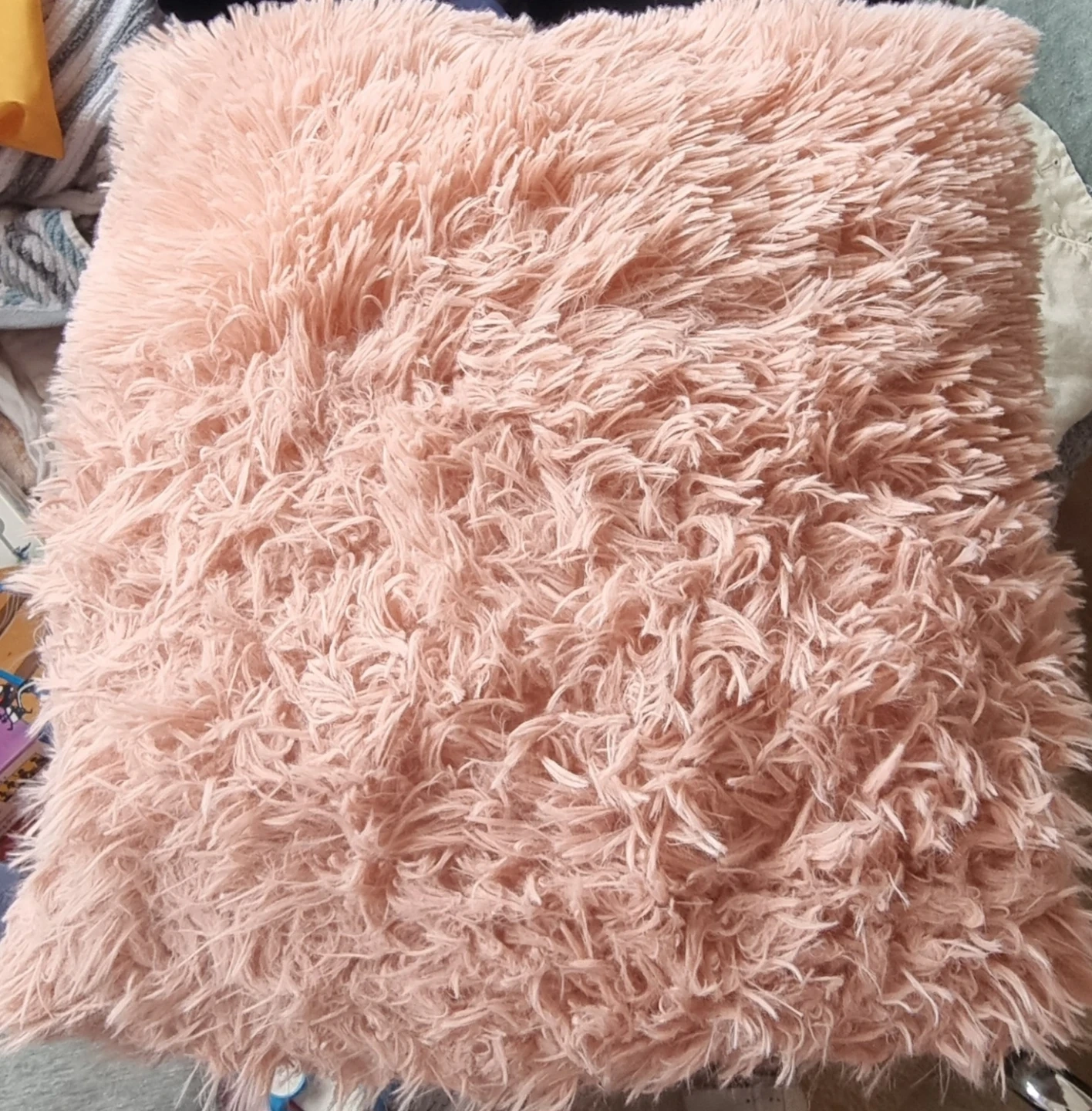 322Add a touch of cozy to your space with these fluffy pink throw pillows! Perfect for adding some texture and warmth to your couch or bed.