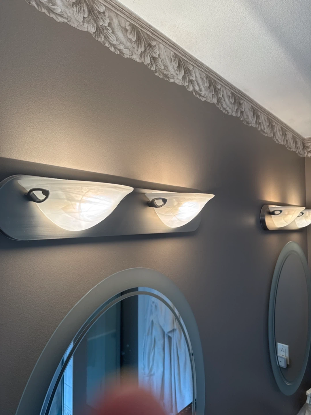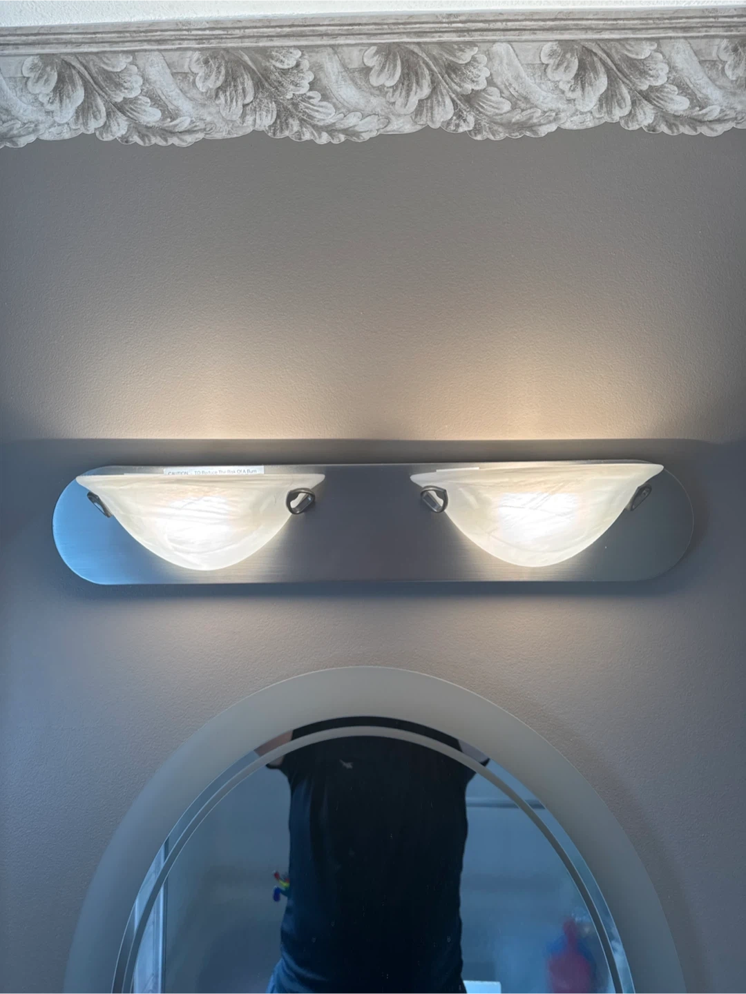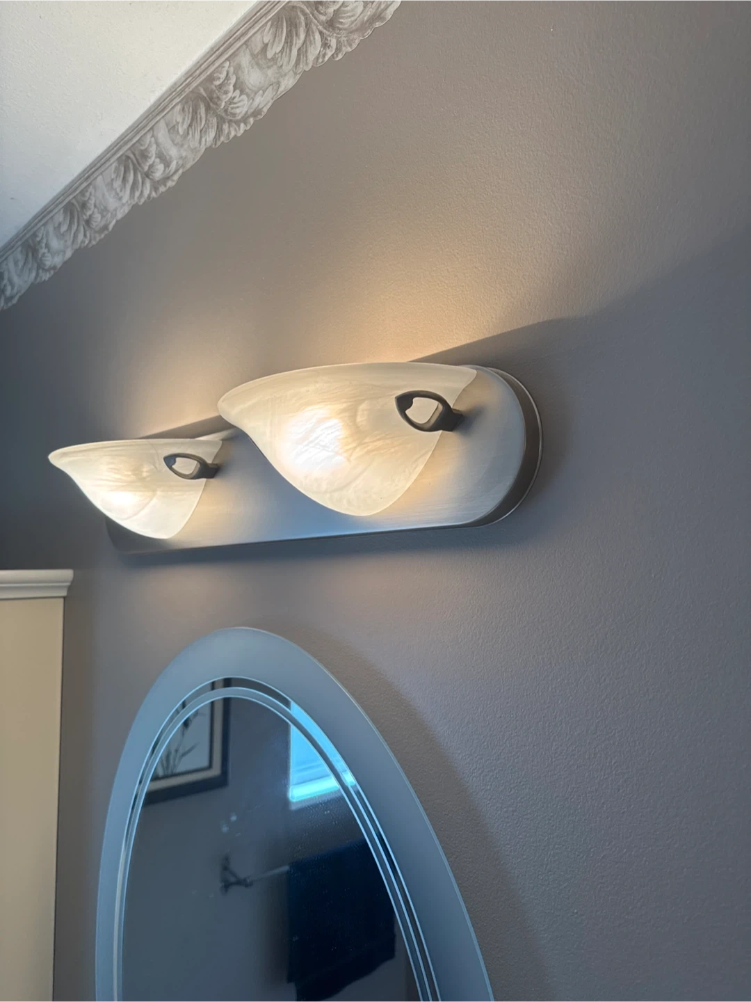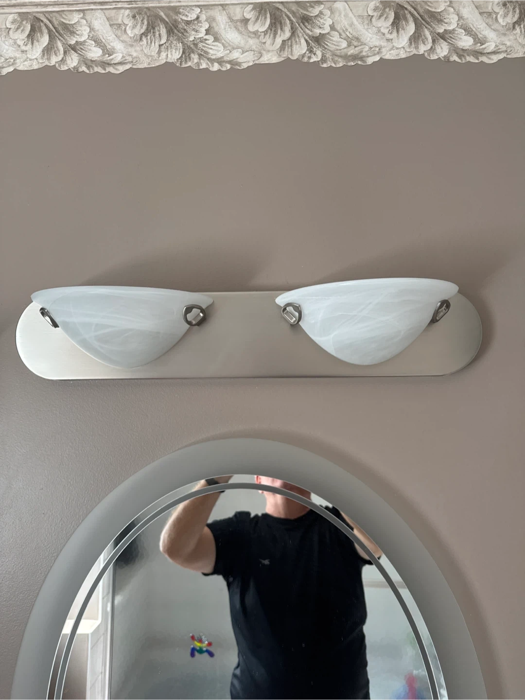 Selling two bathroom vanity light fixtures. They features a sleek design with white glass shades and a brushed metal base. Perfect for adding a touch of elegance to your bathroom. They are in great condition and ready to brighten up your space. Price is for both fixtures.