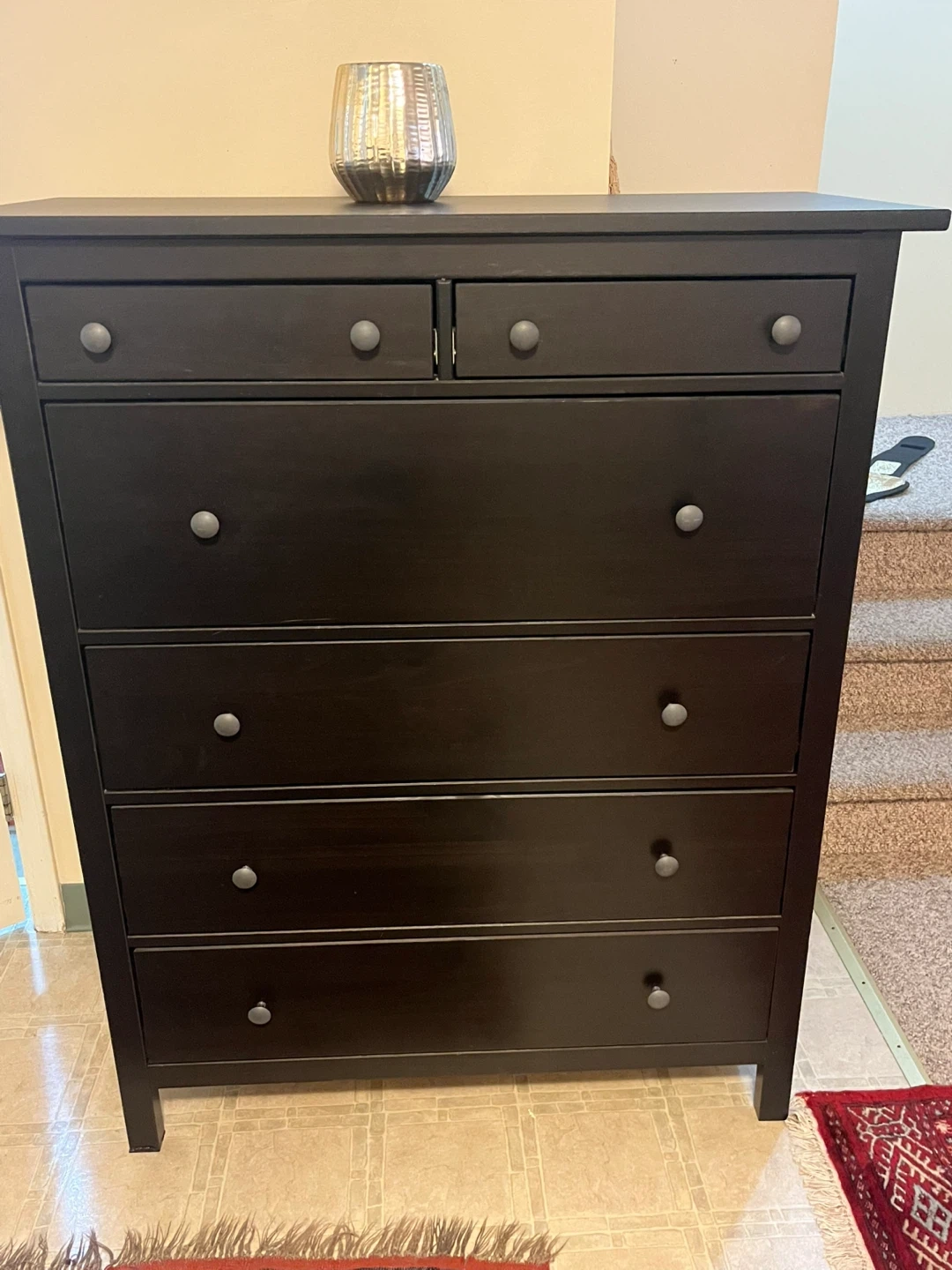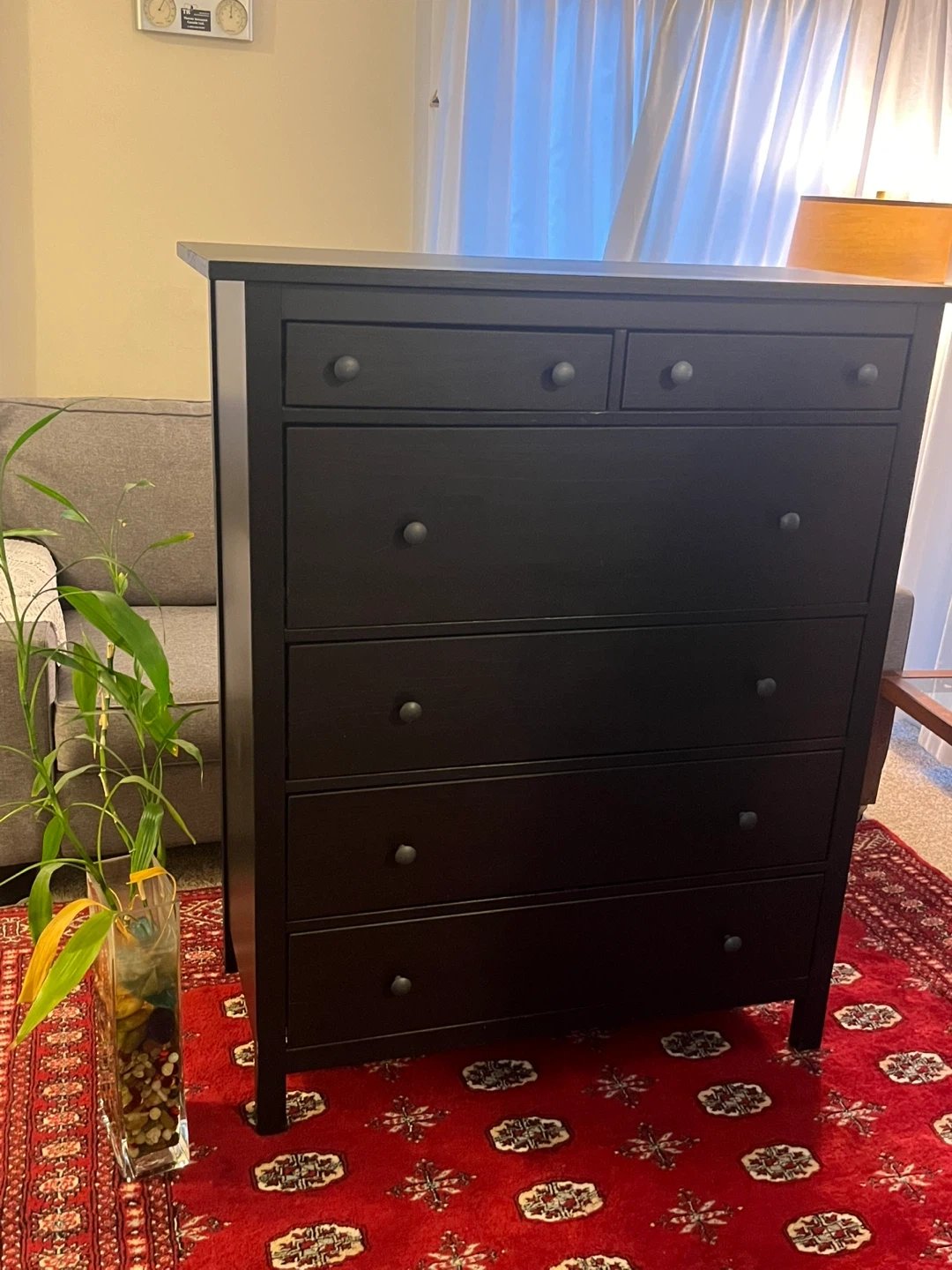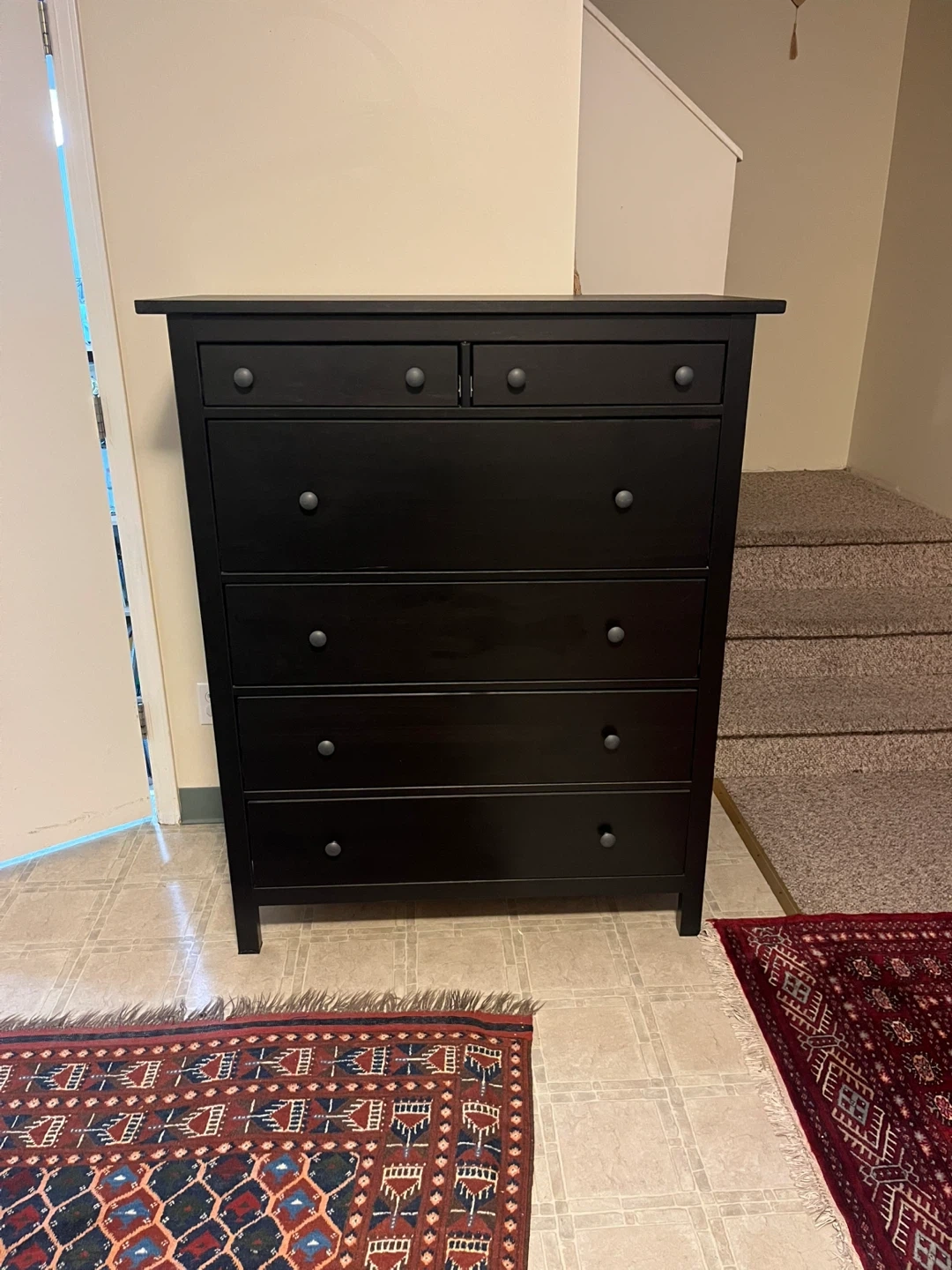 Selling a gently used IKEA Hemnes 6-drawer chest in black-brown. It's in great condition and ready for a new home! This dresser offers ample storage space and a classic design that fits well in any bedroom. The drawers slide smoothly, and the overall construction is sturdy. Perfect for organizing your clothes and keeping your space tidy. It is in excellent condition and I have two chest drawers black and black brown both is in very excellent condition. $300 each