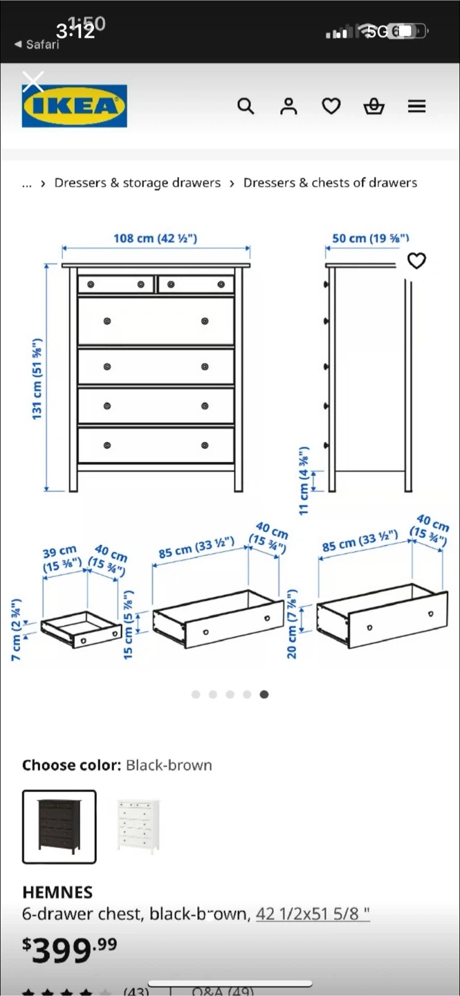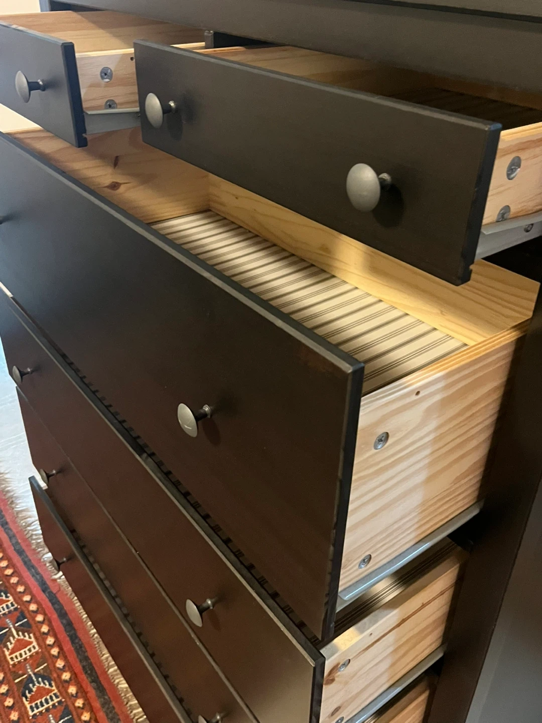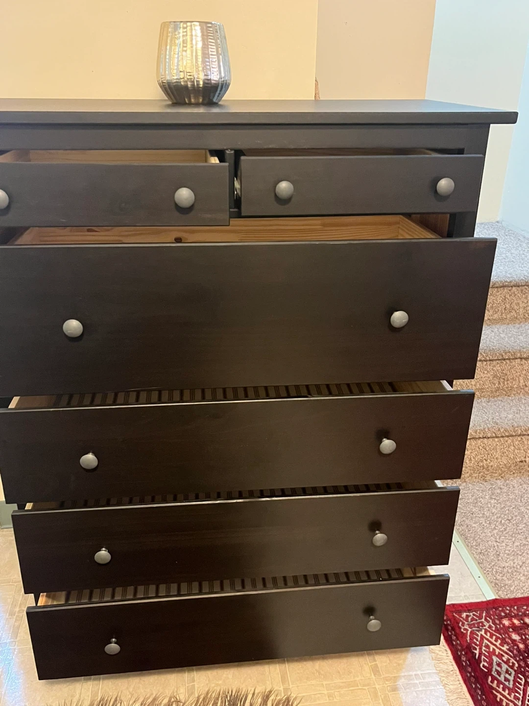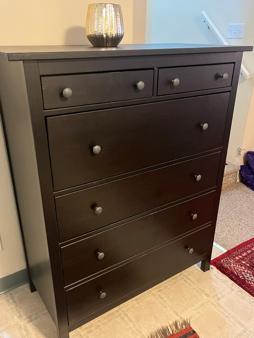 Selling a gently used IKEA Hemnes 6-drawer chest in black-brown. It's in great condition and ready for a new home! This dresser offers ample storage space and a classic design that fits well in any bedroom. The drawers slide smoothly, and the overall construction is sturdy. Perfect for organizing your clothes and keeping your space tidy. It is in excellent condition and I have two chest drawers black and black brown both is in very excellent condition. $300 each