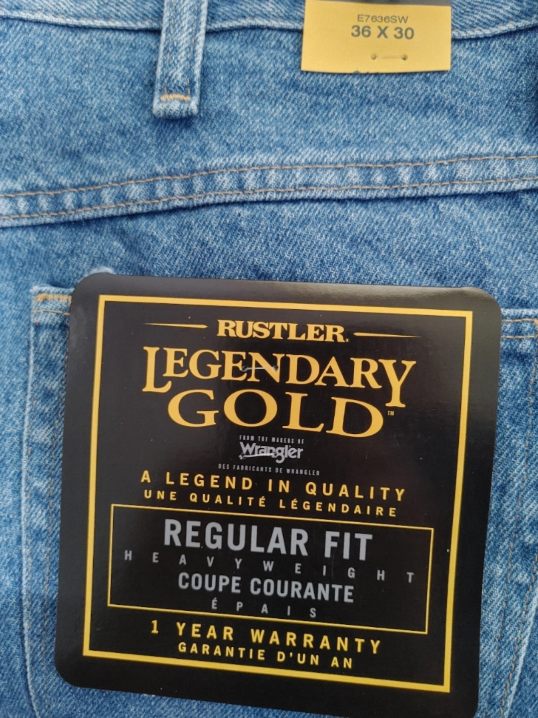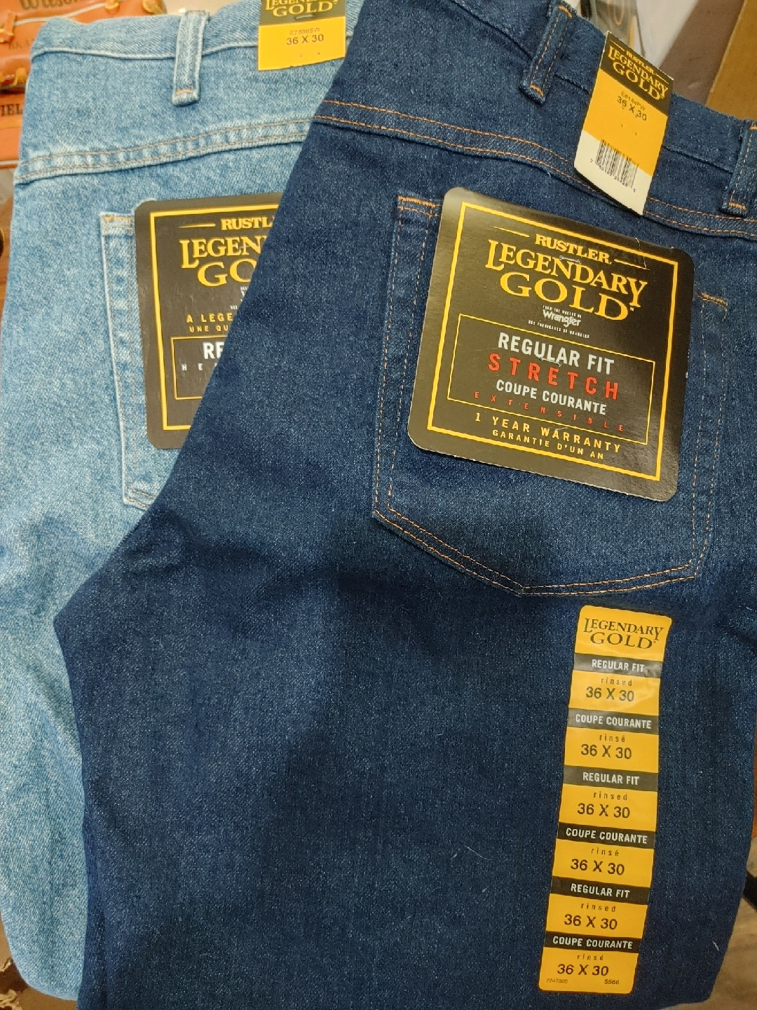 1000+🧡TWO PAIRS OF RUSTLER LEGENDARY GOLD DENIM JEANS. 🧡ONE IS LIGHT COLOURED DENIM & THE OTHER A DARKER INDIGO COLOUR. 🧡MENS SIZE 36 X 30 🧡BRAND NEW WITH ALL TAGS. 🧡I AM LOCATED IN THE YONGE AND STEELES AREA FOR PICKUP