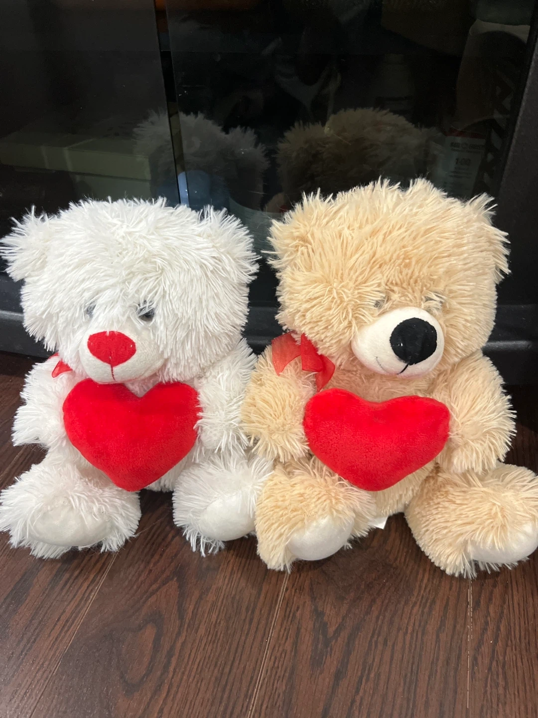 33Selling two adorable plush teddy bears, one white and one beige. Both are holding red hearts. They're in great condition and ready for a new home!