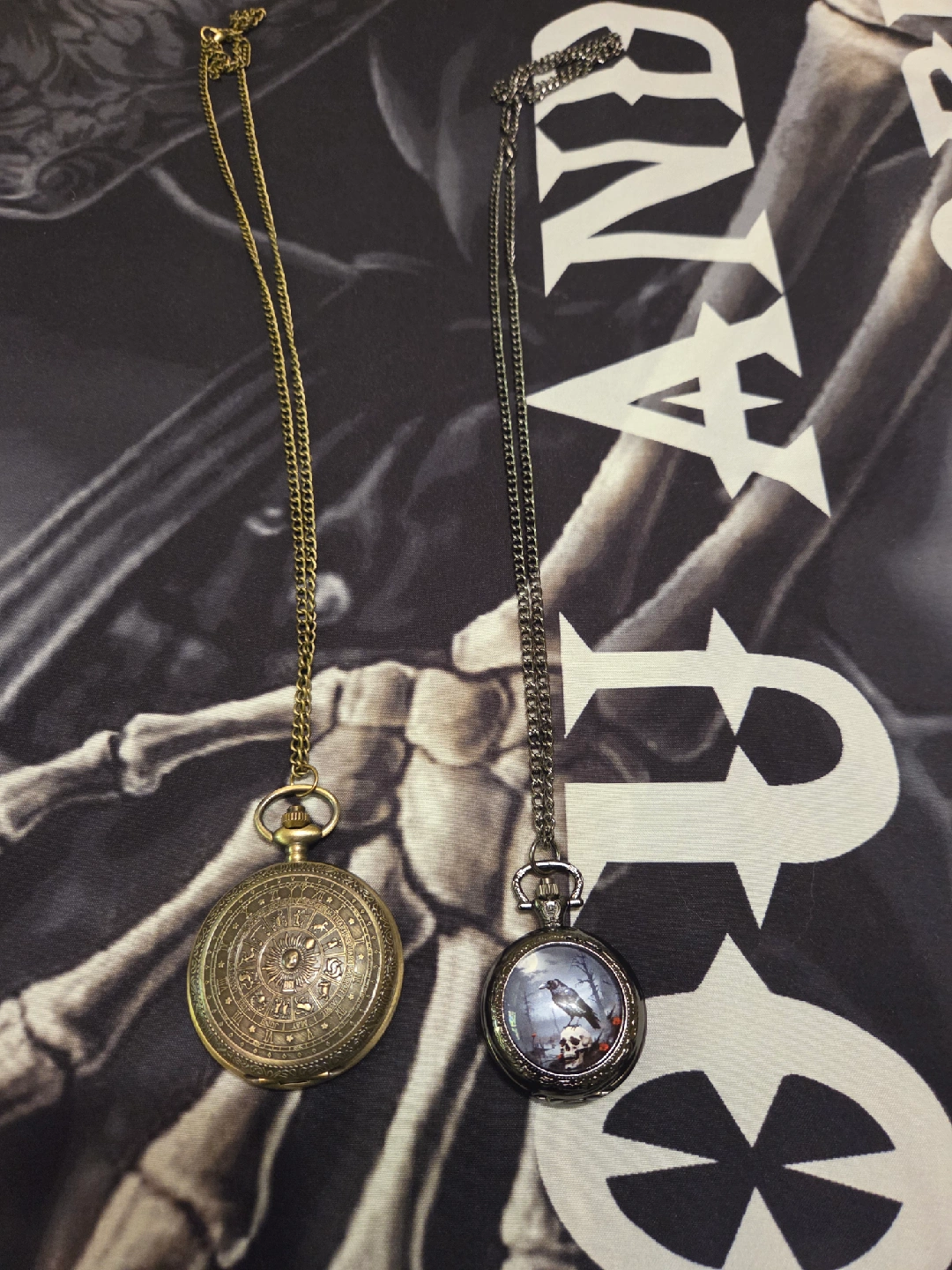 26Selling two unique pocket watch necklaces! One is gold with zodiac symbols, and the other is silver with a raven and skull design. They're both in great condition and would make a cool addition to any outfit