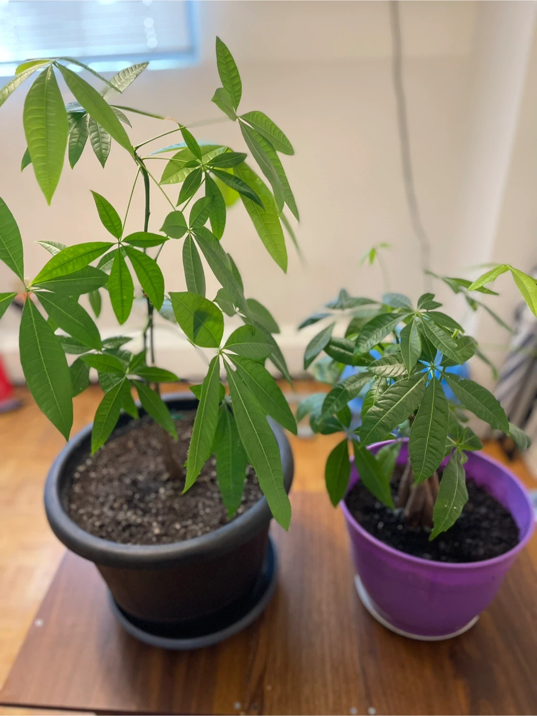 Two potted money trees are looking for a new home! One is in a black pot and the other is in a purple pot. They're both in good condition and ready to brighten up your space