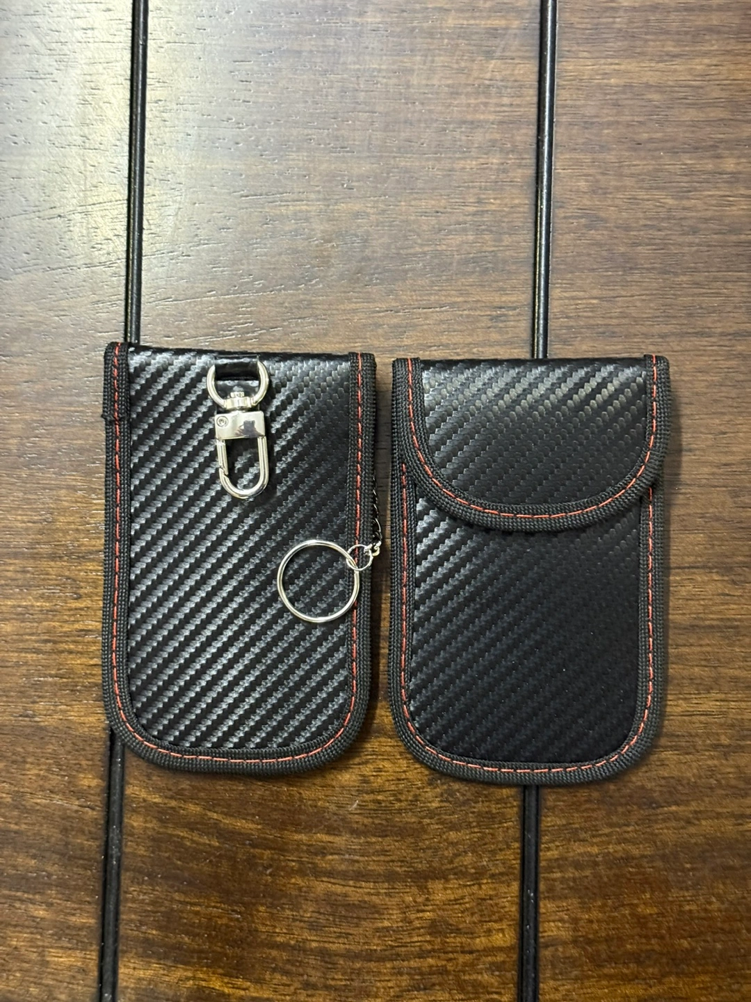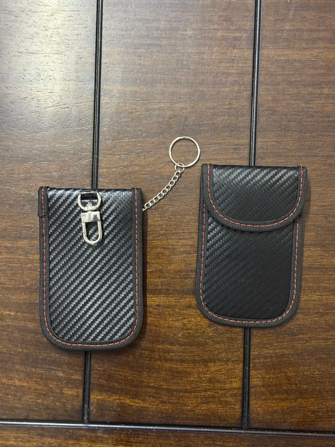 Set of two black carbon fibre key pouches. Red stitching detail. One pouch features a keychain. Protects against RFID scanning.