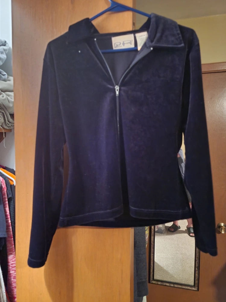 Cozy velvet jacket from Two Roads! It's a size medium and made of 94% polyester and 6% spandex. Perfect for adding a touch of elegance to your outfit