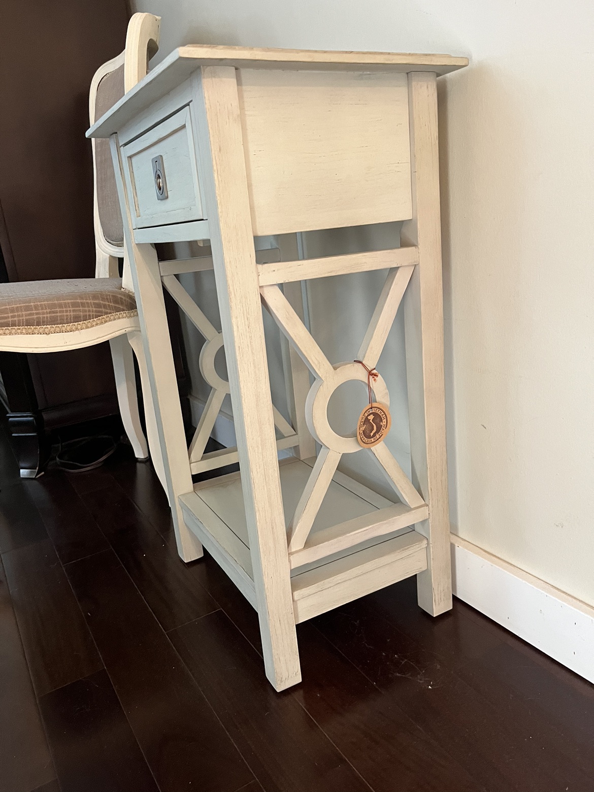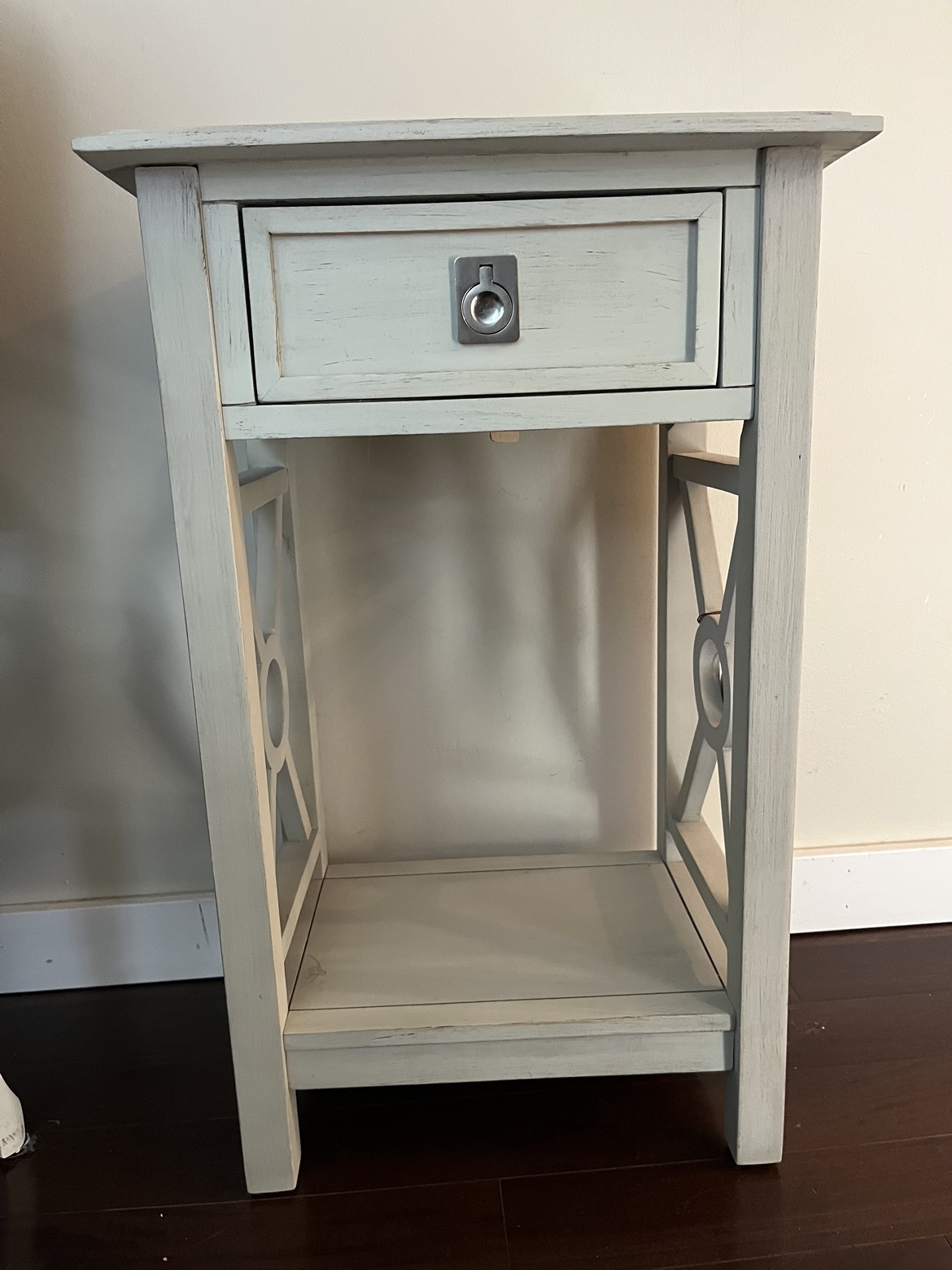 25These beautiful side tables are in brand new condition. There is a small drawer at the top and a ledge on the bottom. I’m selling them for $120 for both or $75 a piece.