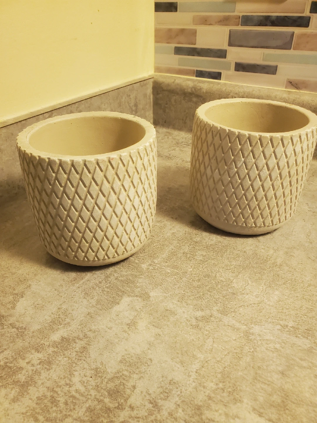 0Selling two beige-coloured flower pots with a textured diamond pattern! They're in great condition and would look lovely with some greenery.