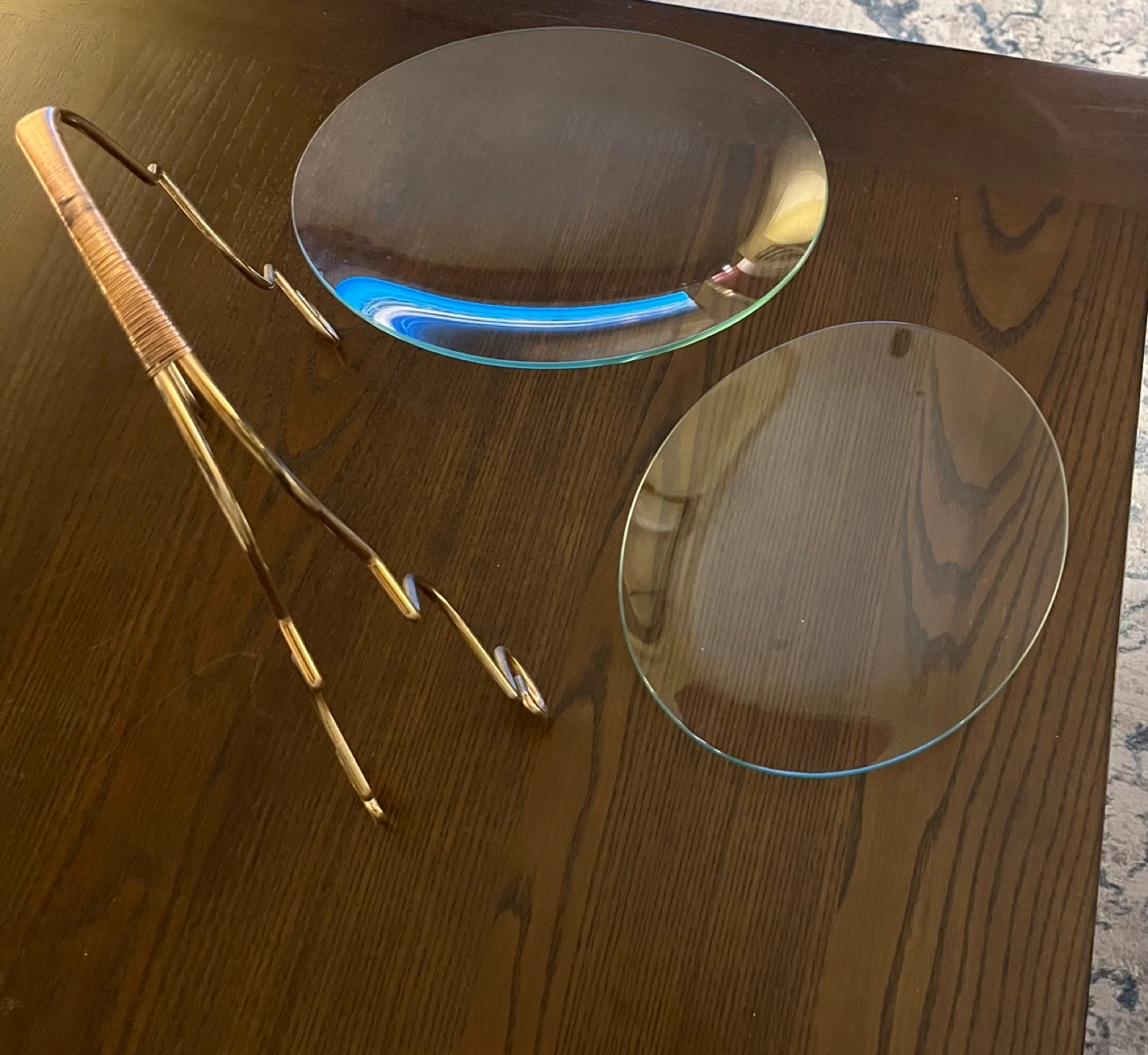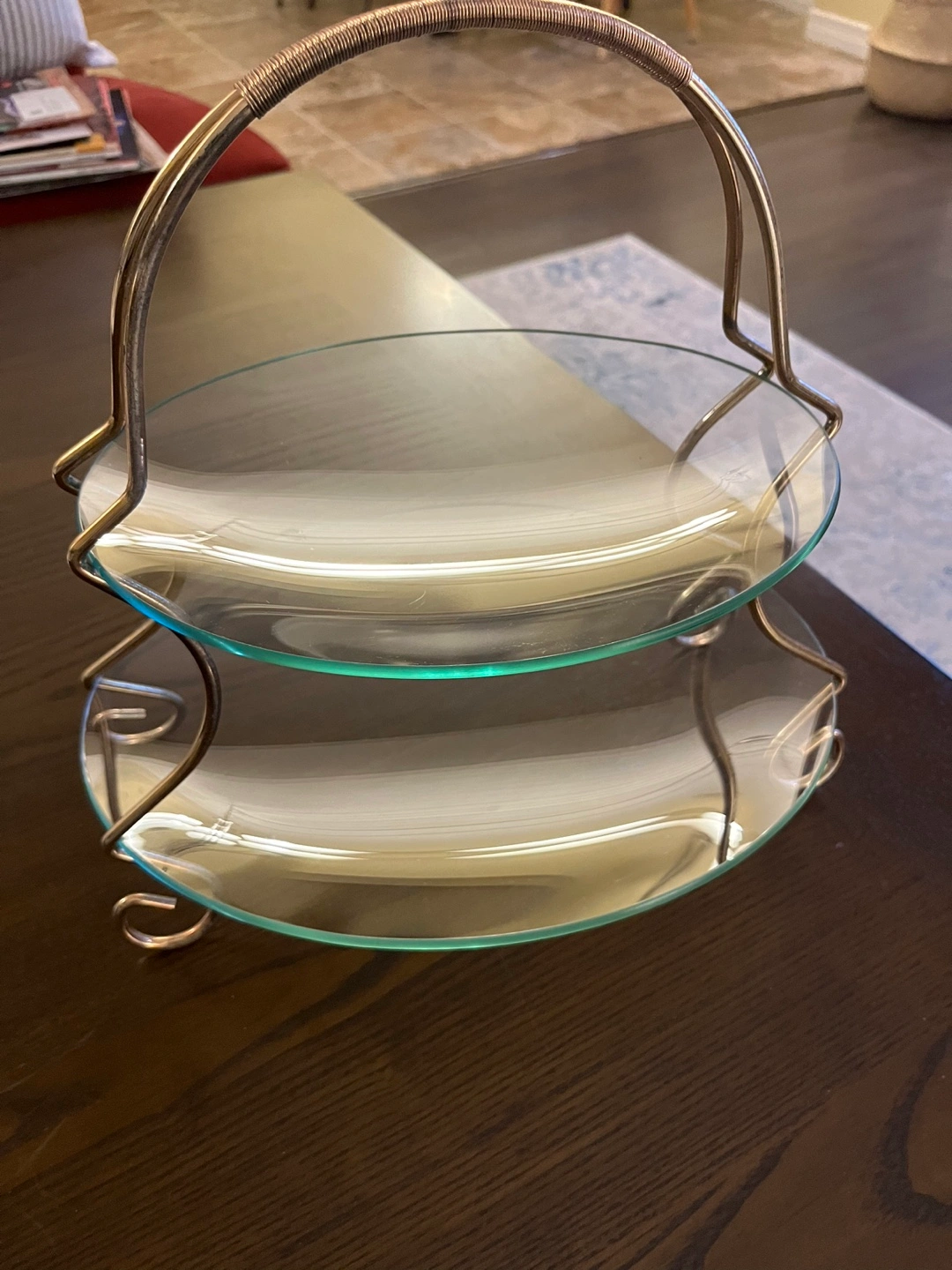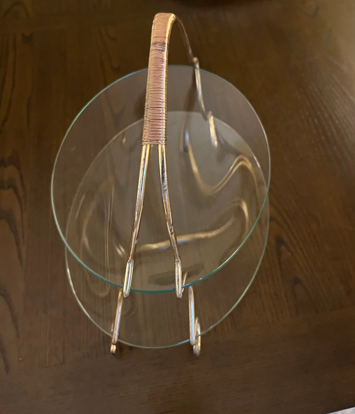 Elegant two-tiered serving stand. Features round glass plates and a decorative metal frame with a woven handle. Perfect for parties or everyday use.