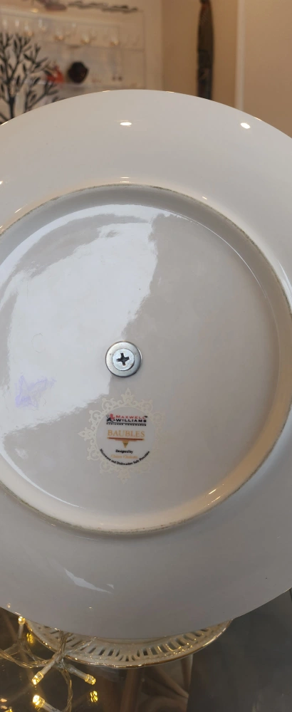 Two-tiered serving platter with a silver handle. Features a Christmas design.