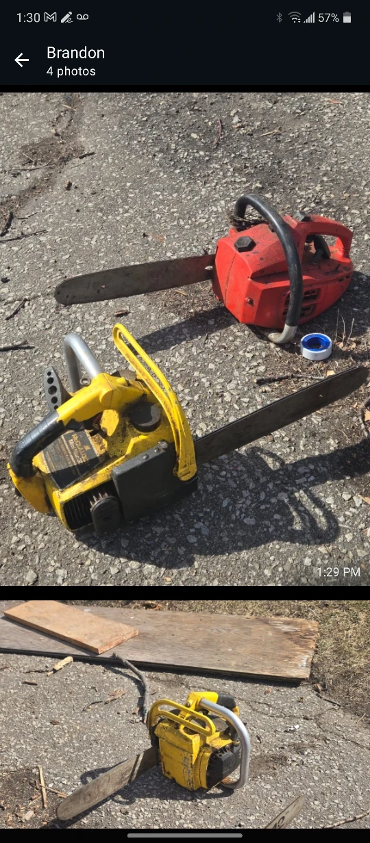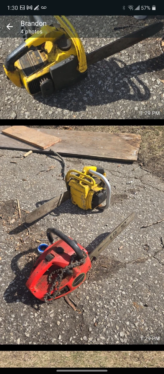 Pair of used chainsaws. One yellow, one red. Sold as is. Good for parts or restoration. Buyer responsible for pickup.