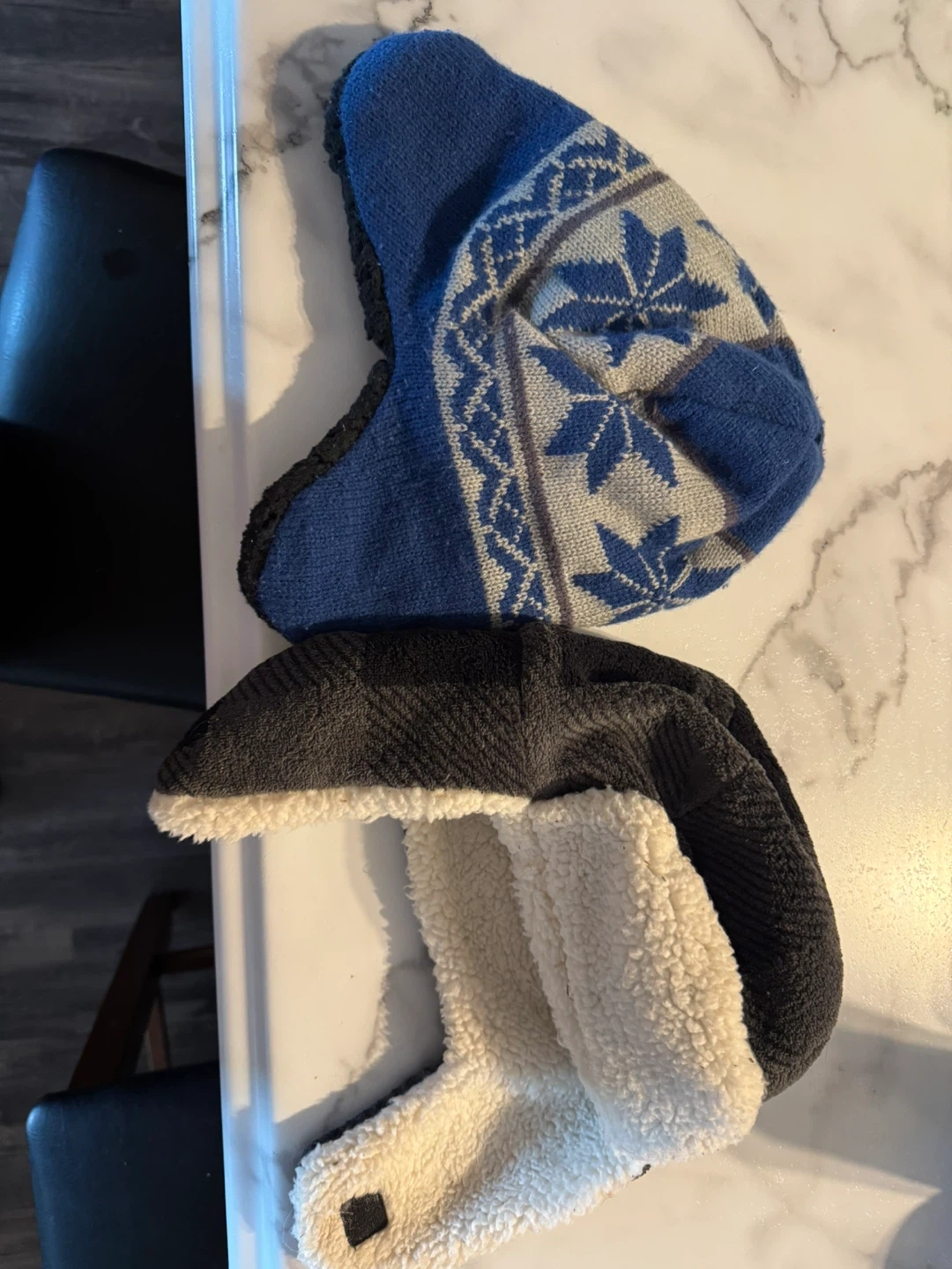 60Two winter hats for sale! One is a blue and grey patterned hat, and the other is a black hat with a white sherpa-like lining. Both are in good condition and ready to keep you warm this winter Never worn, he outgrew them before we could use them