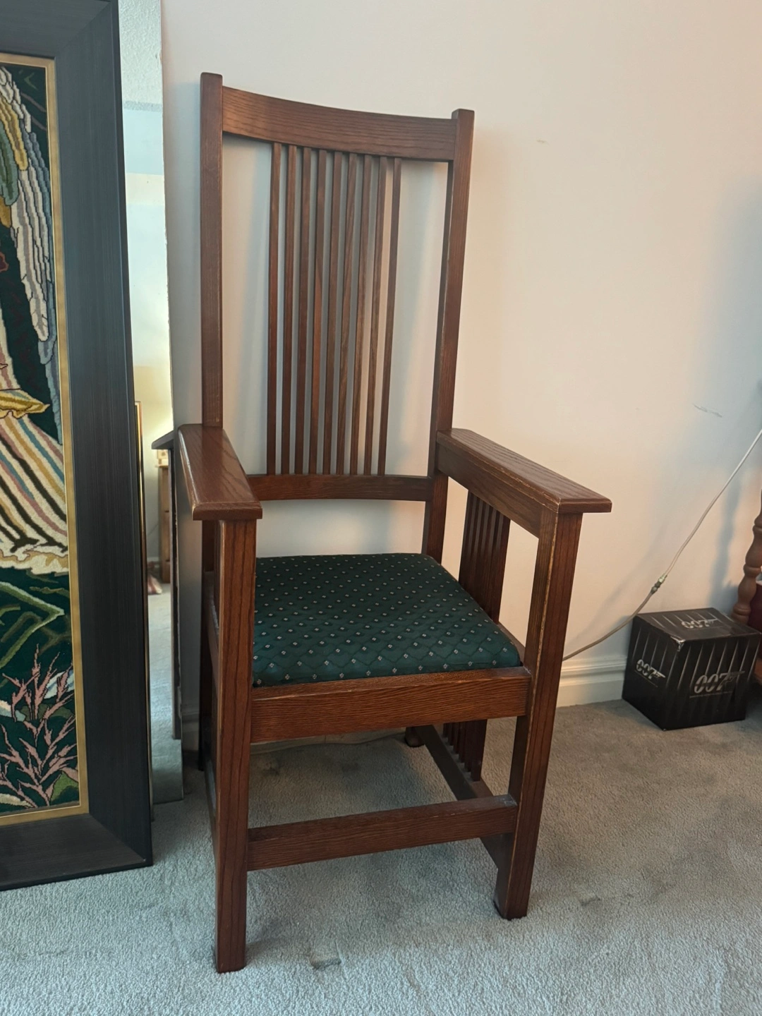 Here's a lovely wooden armchair with a green patterned cushion! It's a sturdy and classic piece that would look great in any room. The chair has a high back with vertical slats and comfortable armrests. It's in good condition and ready for a new home