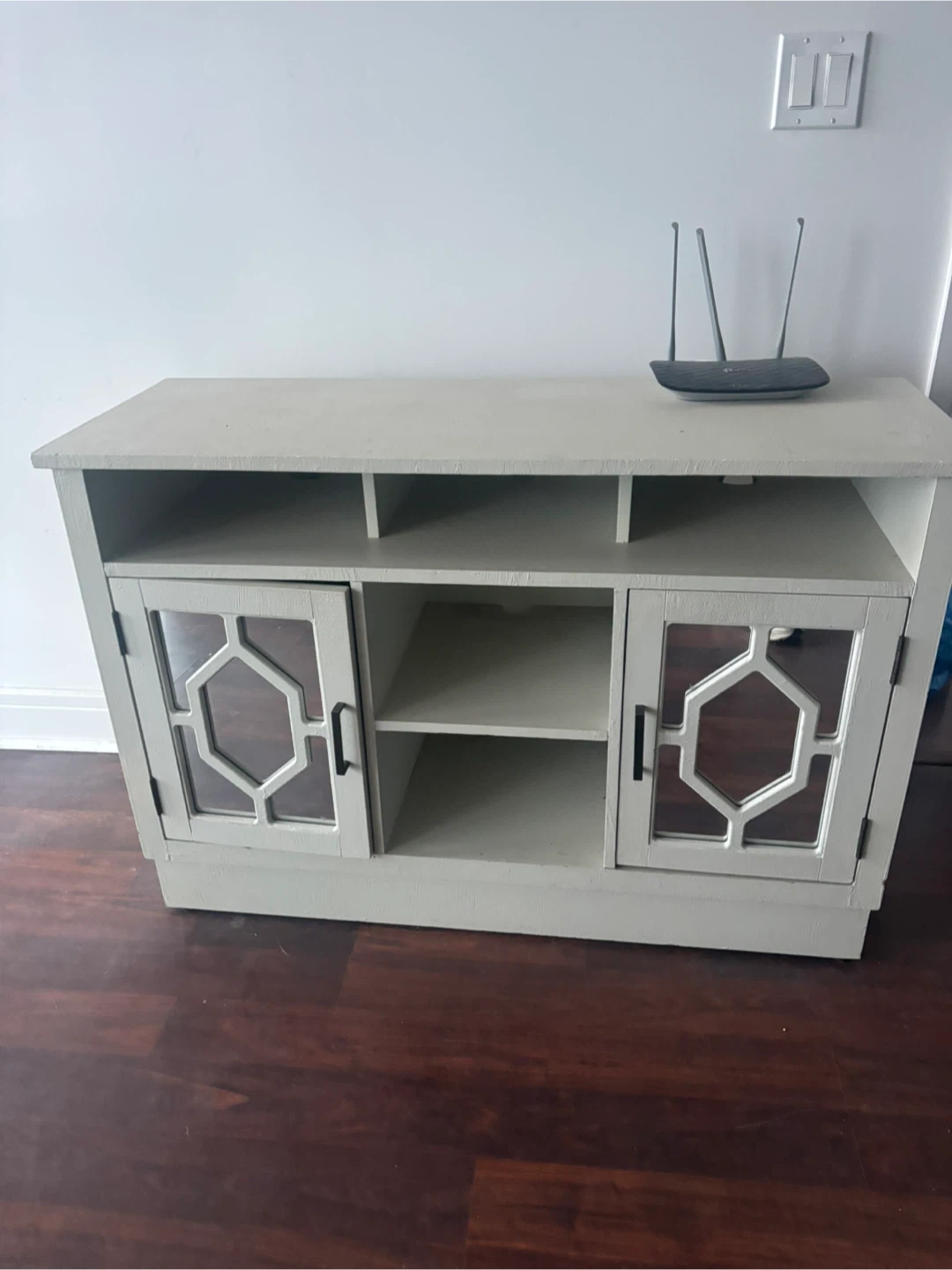 This TV stand offers ample storage with two cabinets and multiple open shelves. It's a stylish and functional piece for your living room. The distressed finish adds a touch of rustic charm. Perfect for organizing your media devices and accessories!