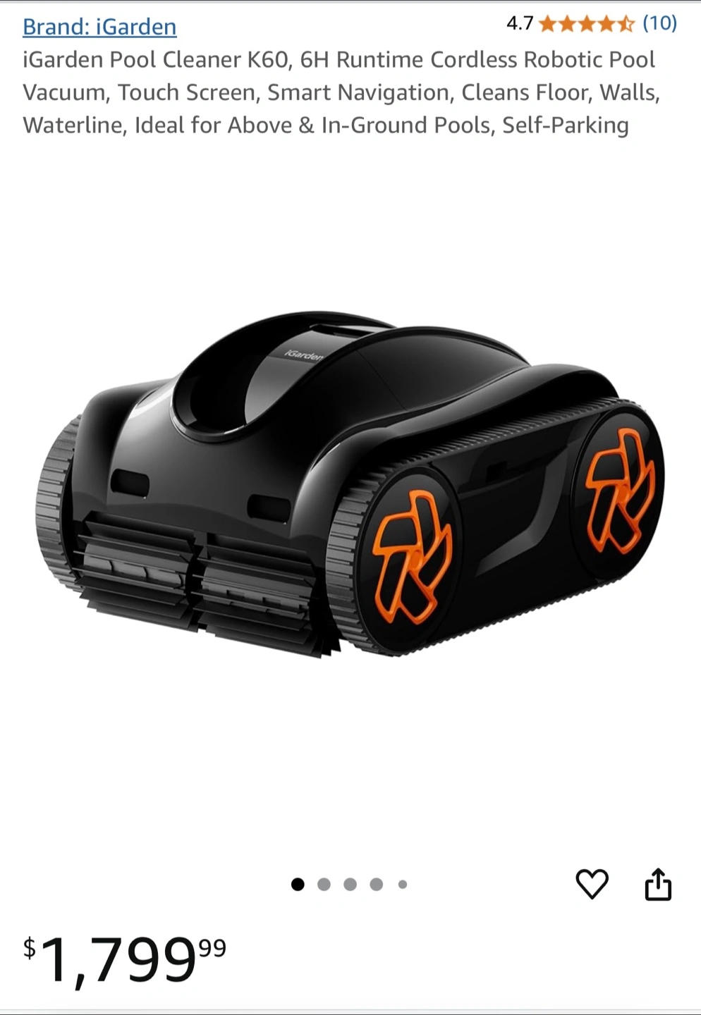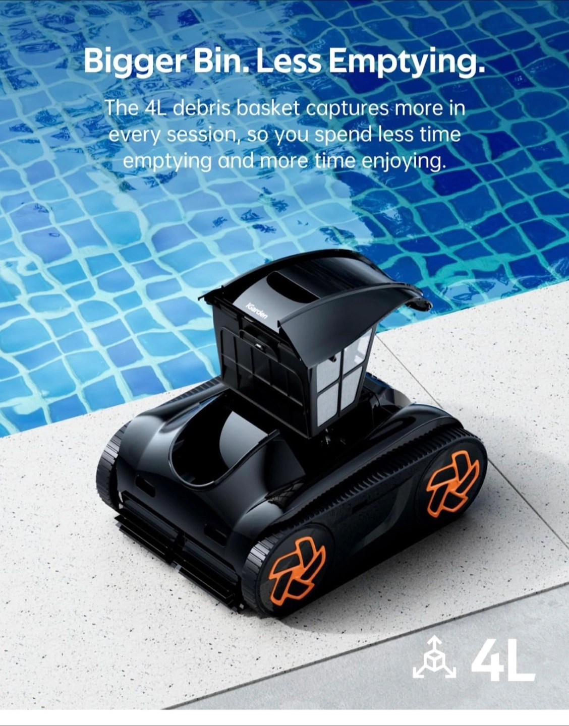iGarden K60 robotic pool cleaner. Cordless, 6-hour runtime. Smart navigation cleans floor, walls, and waterline. Self-parking. 4L debris basket. Ideal for above and in-ground pools.