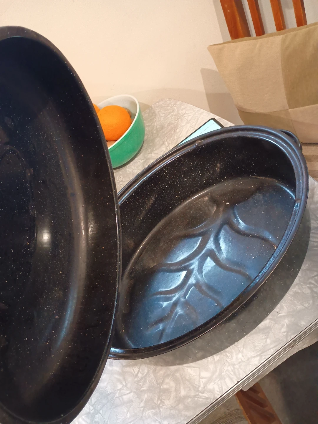 This is a black speckled roasting pan with a lid. It's oval-shaped and features embossed detailing on the bottom. The pan comes with its matching lid. It's great for roasting larger cuts of meat or poultry!