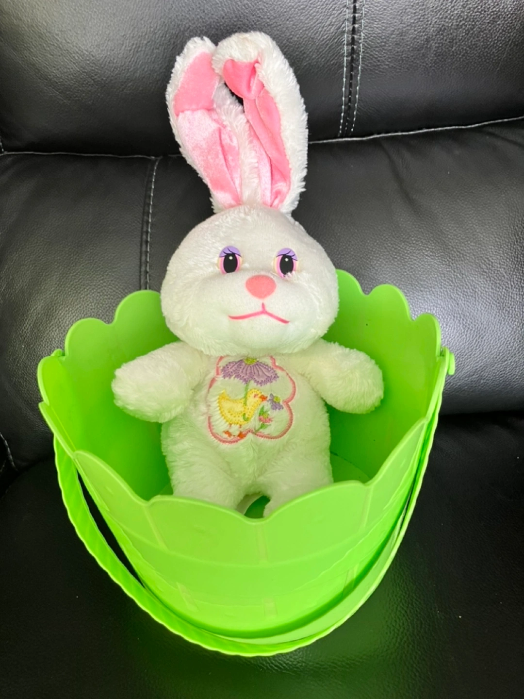 White plush bunny, pink ears. Embroidered chick design. Green plastic bucket. Perfect Easter gift or décor.
