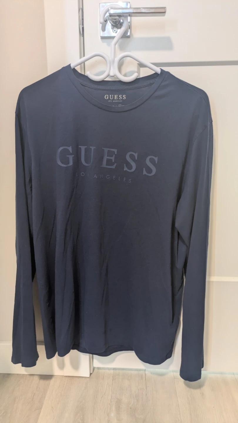 A dark blue Guess long-sleeve t-shirt with the Guess Los Angeles logo printed on the front. It's made of soft material for comfort.