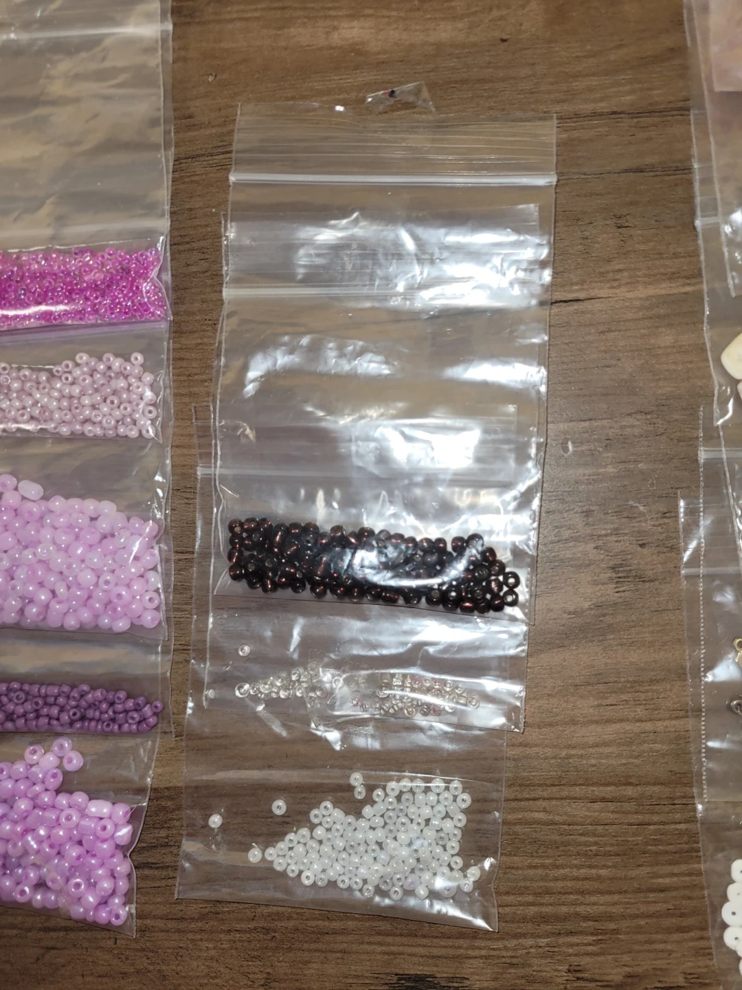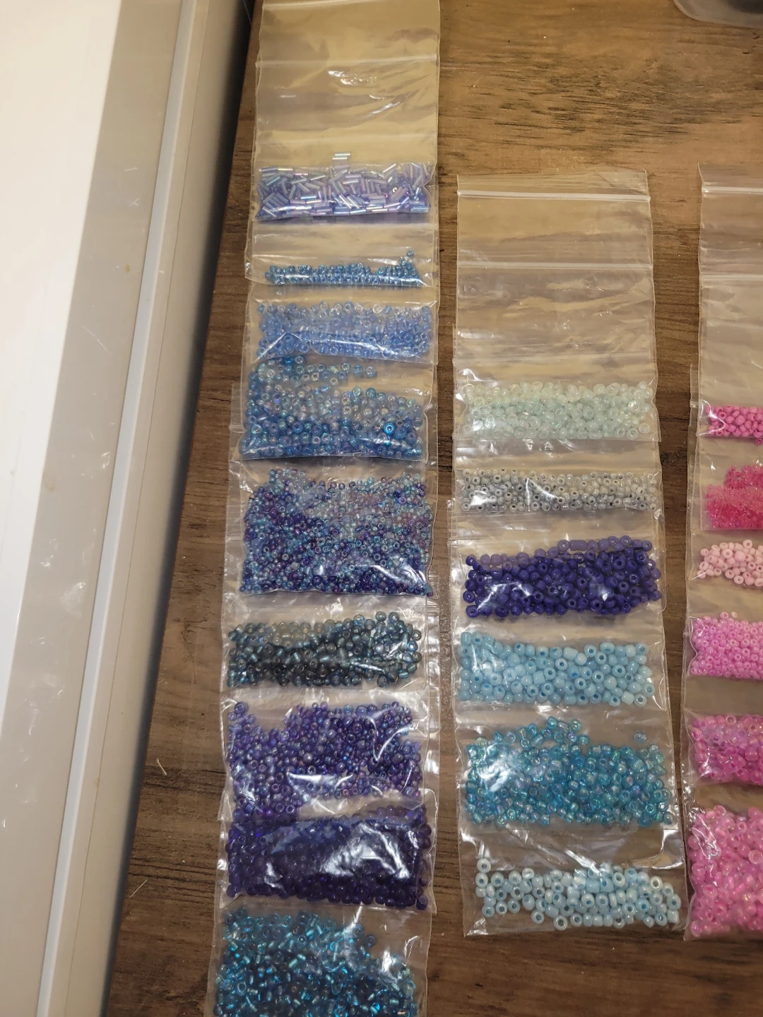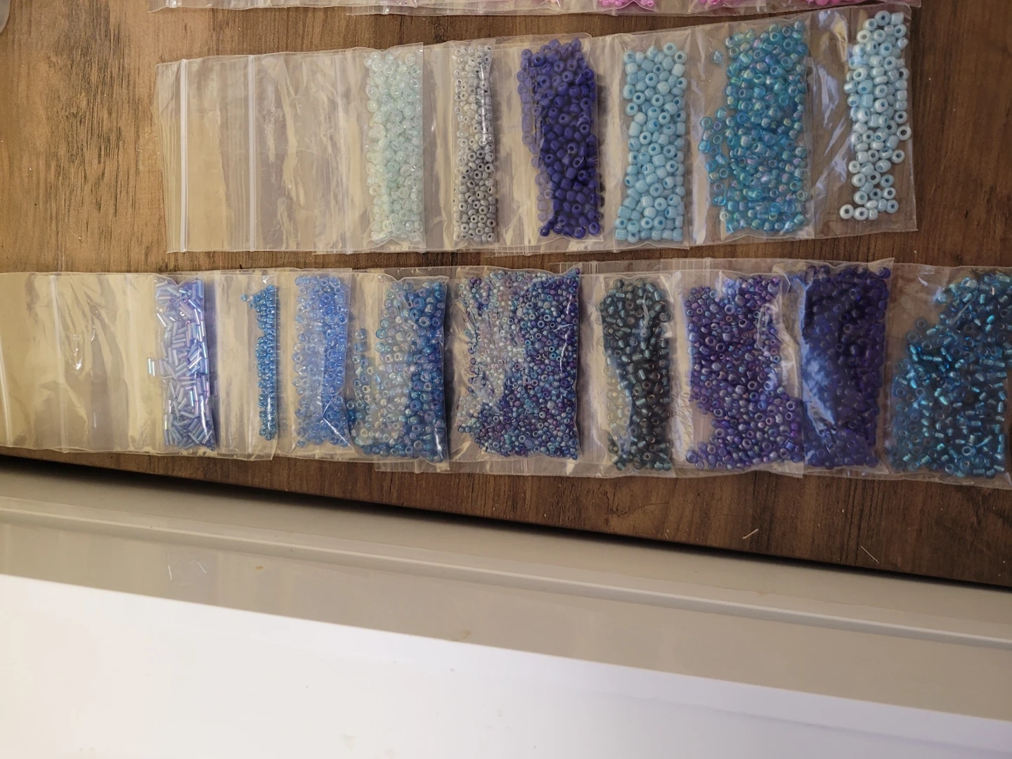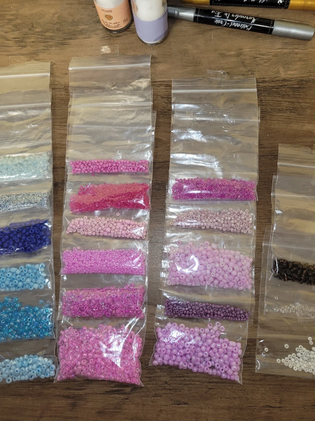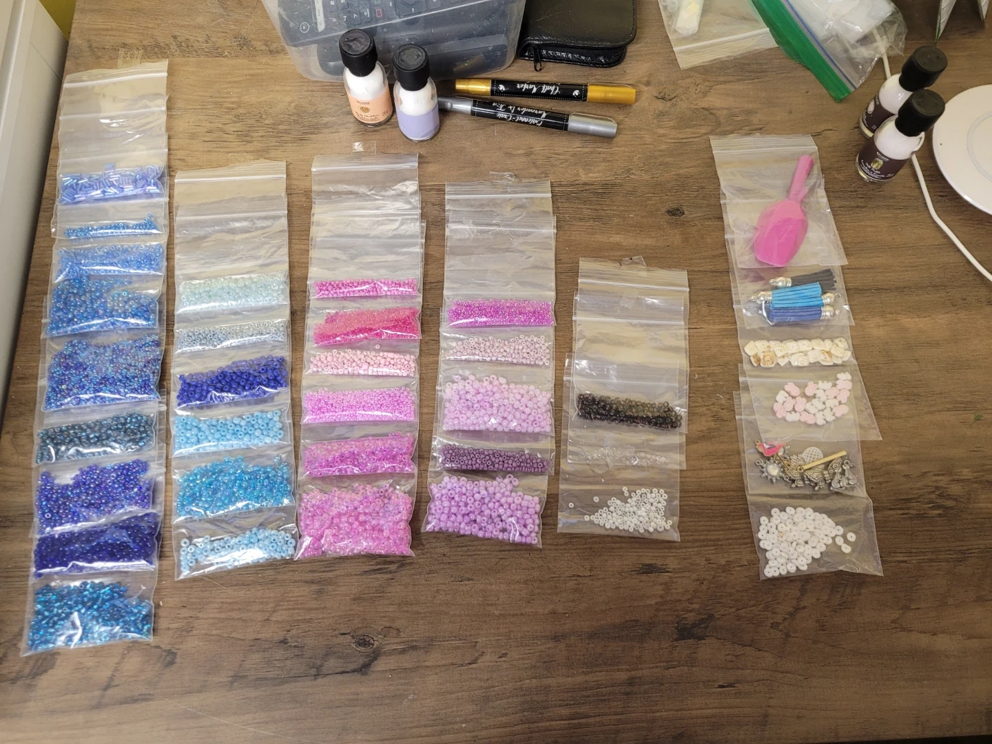 Collection of small glass beads in various shades of blue, purple, pink, and clear. Great for DIY jewelry making and other crafts. Includes different shapes and sizes.