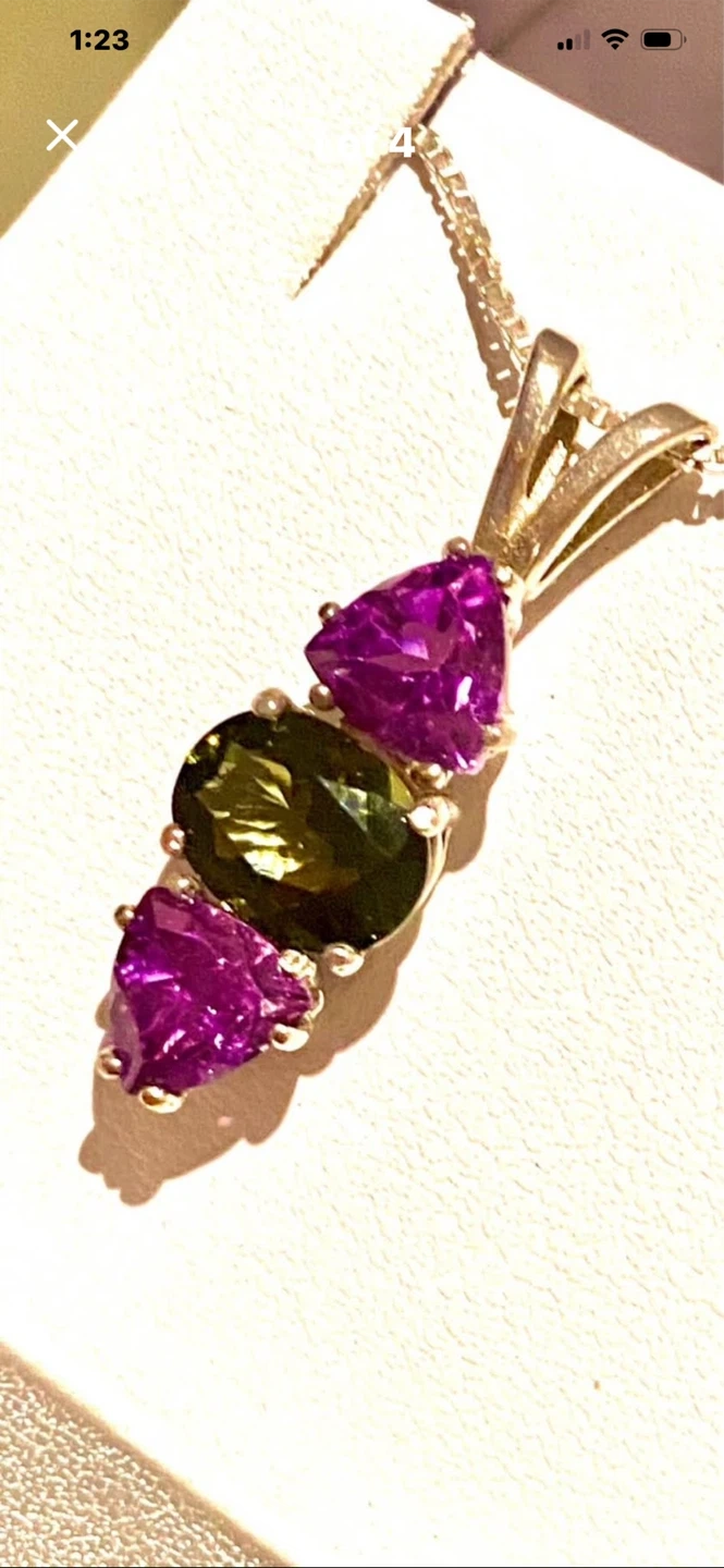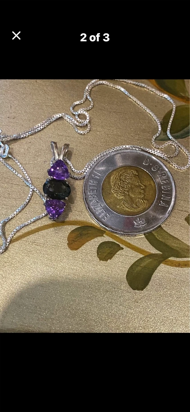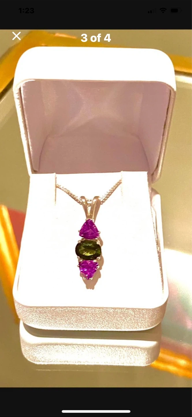 💚💜A beautiful sterling silver pendant necklace featuring three gemstones: two triangular amethyst stones and an oval green quartz stone. This necklace comes in a white jewellery box. It's a lovely piece for adding a touch of colour to any outfit!💜💚