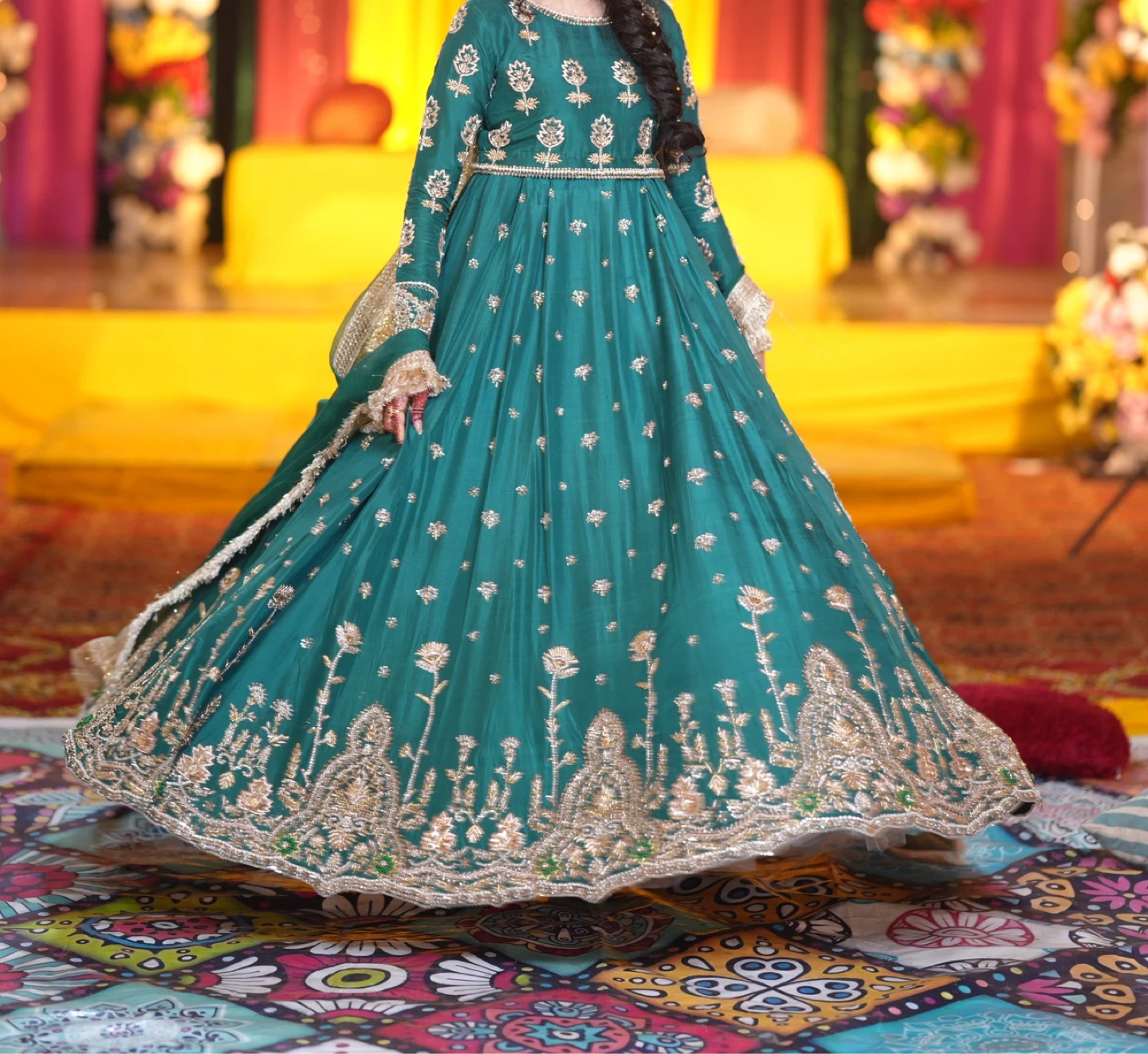 Beautiful green Lehnga Choli with intricate gold embroidery and embellishments throughout. It comes with a matching dupatta and a small, ornate clutch. Perfect for special occasions and festive events! YOUR BEST FIT FOR MEHNDI