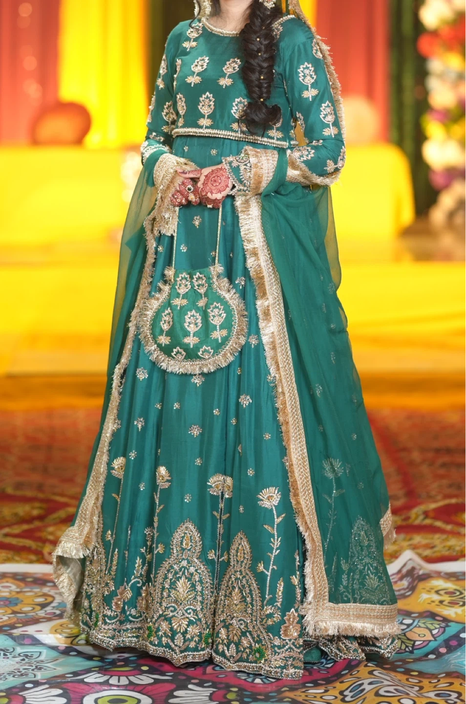 Beautiful green Lehnga Choli with intricate gold embroidery and embellishments throughout. It comes with a matching dupatta and a small, ornate clutch. Perfect for special occasions and festive events! YOUR BEST FIT FOR MEHNDI