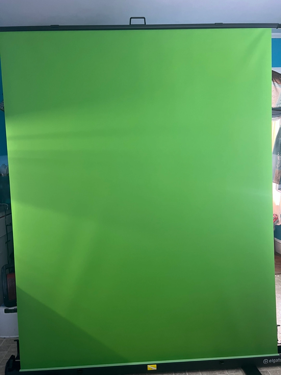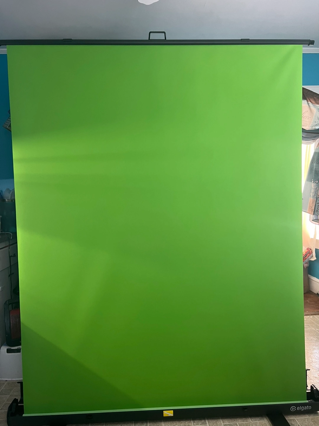 This is a portable Elgato green screen backdrop. It's perfect for streamers and content creators needing a simple way to set up a chroma key background. The backdrop is green and designed for easy setup and breakdown.
