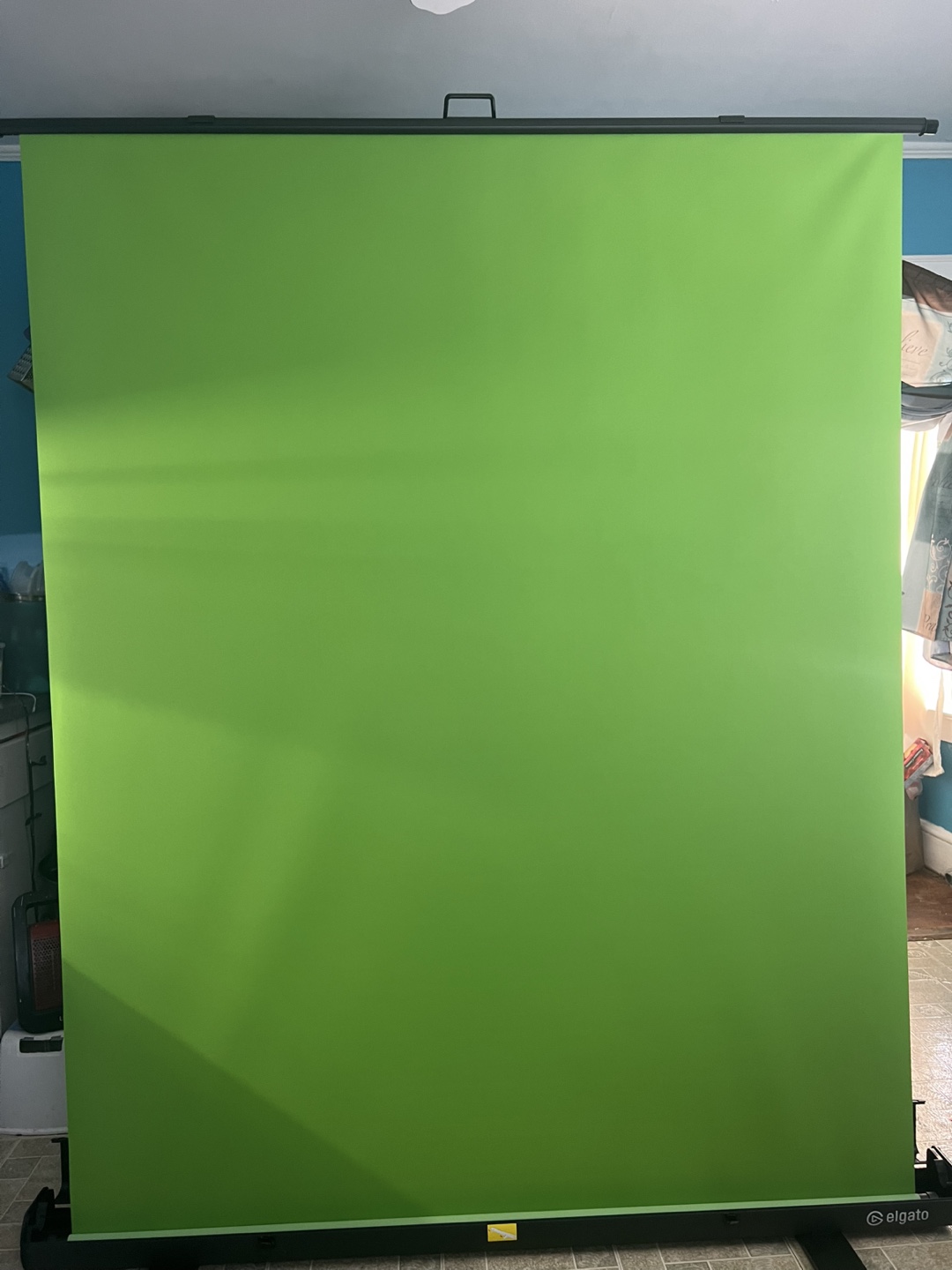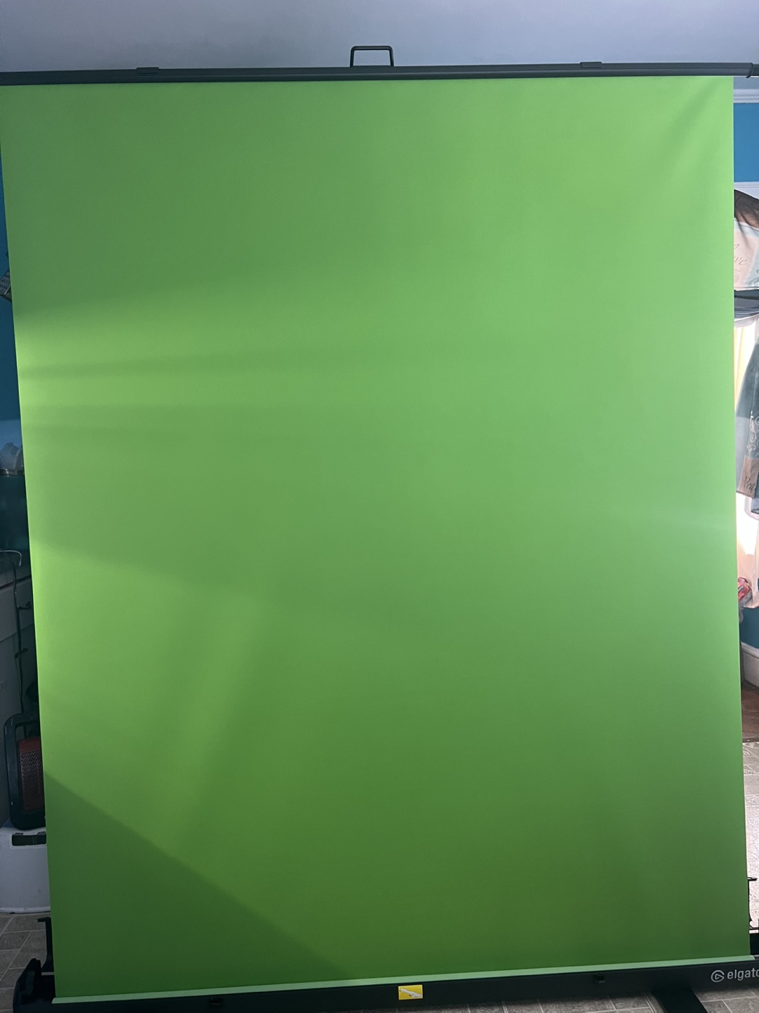 This is a portable Elgato green screen backdrop. It's perfect for streamers and content creators needing a simple way to set up a chroma key background. The backdrop is green and designed for easy setup and breakdown.