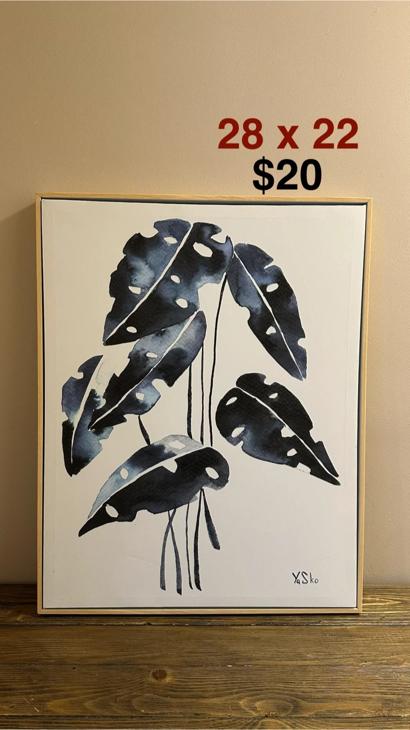 This is a 28 by 22 inch framed canvas print featuring abstract dark leaves on a white background. The artwork is signed "Y.Sko". A great piece for adding a touch of modern art to your home!