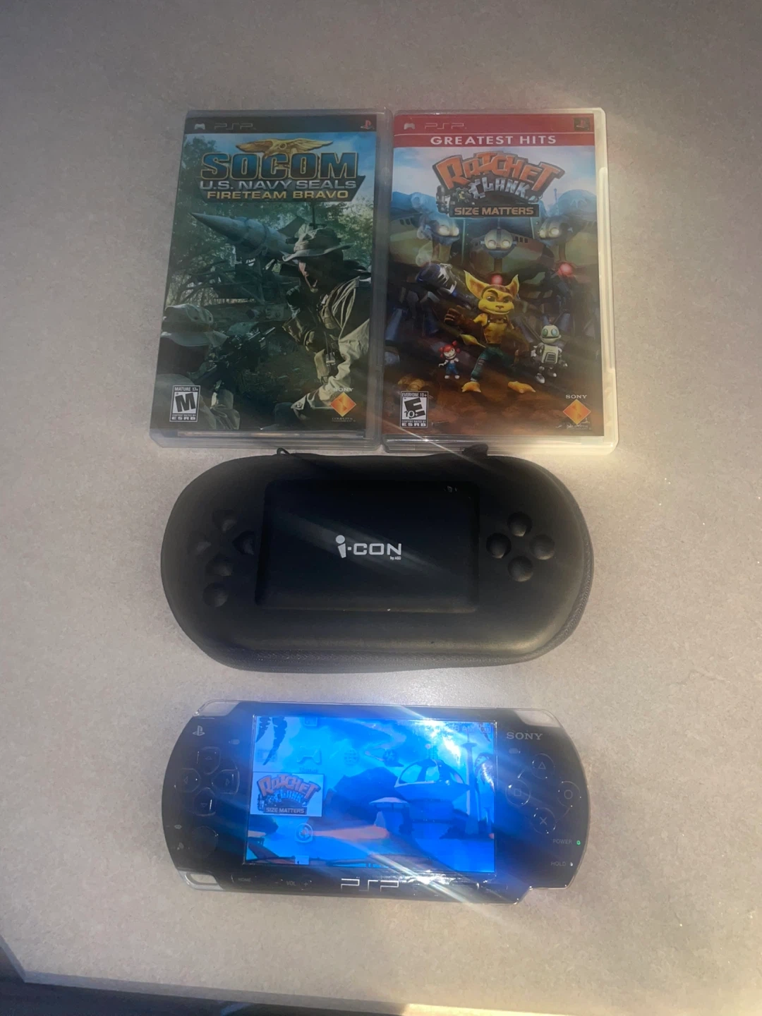 Im selling my Sony PSP handheld console. It comes with the games SOCOM U.S. Navy SEALs: Fireteam Bravo, Ratchet & Clank: Size Matters, and MotorStorm Arctic Edge. It includes a black carrying case. And a ps3 original console
