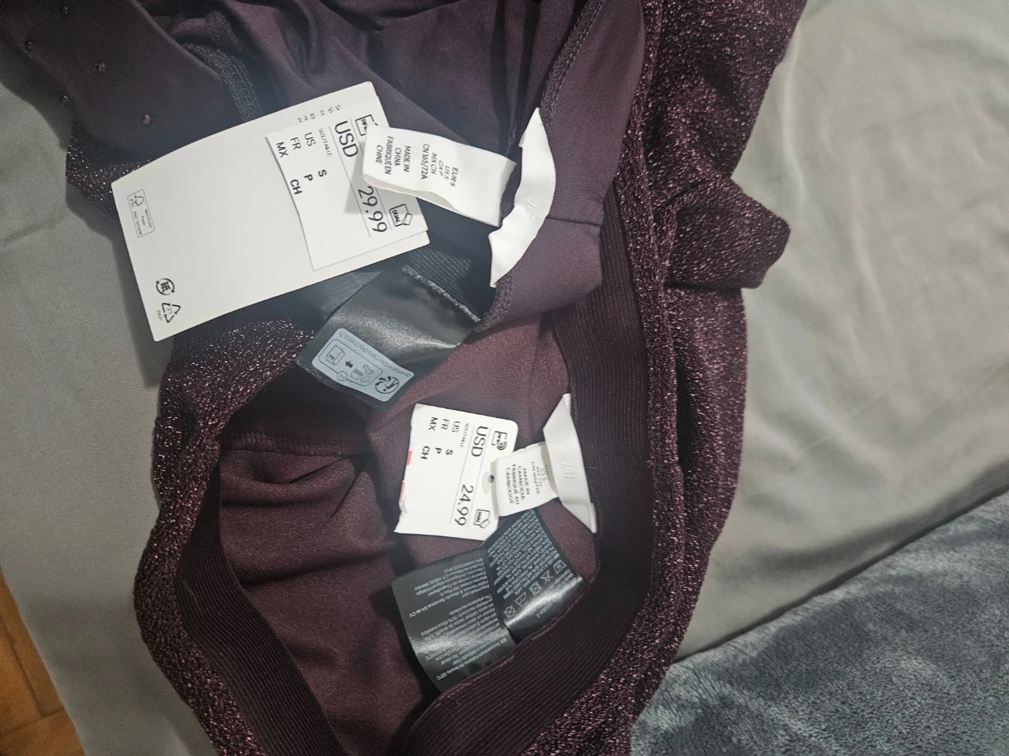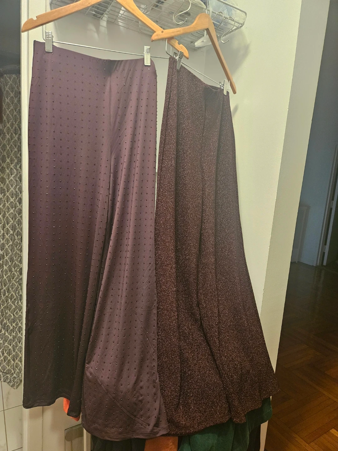 Two H&M maxi pants One features a glittery fabric in a deep purple hue. The other is a solid dark purple with all-over beading. Both are size S.
