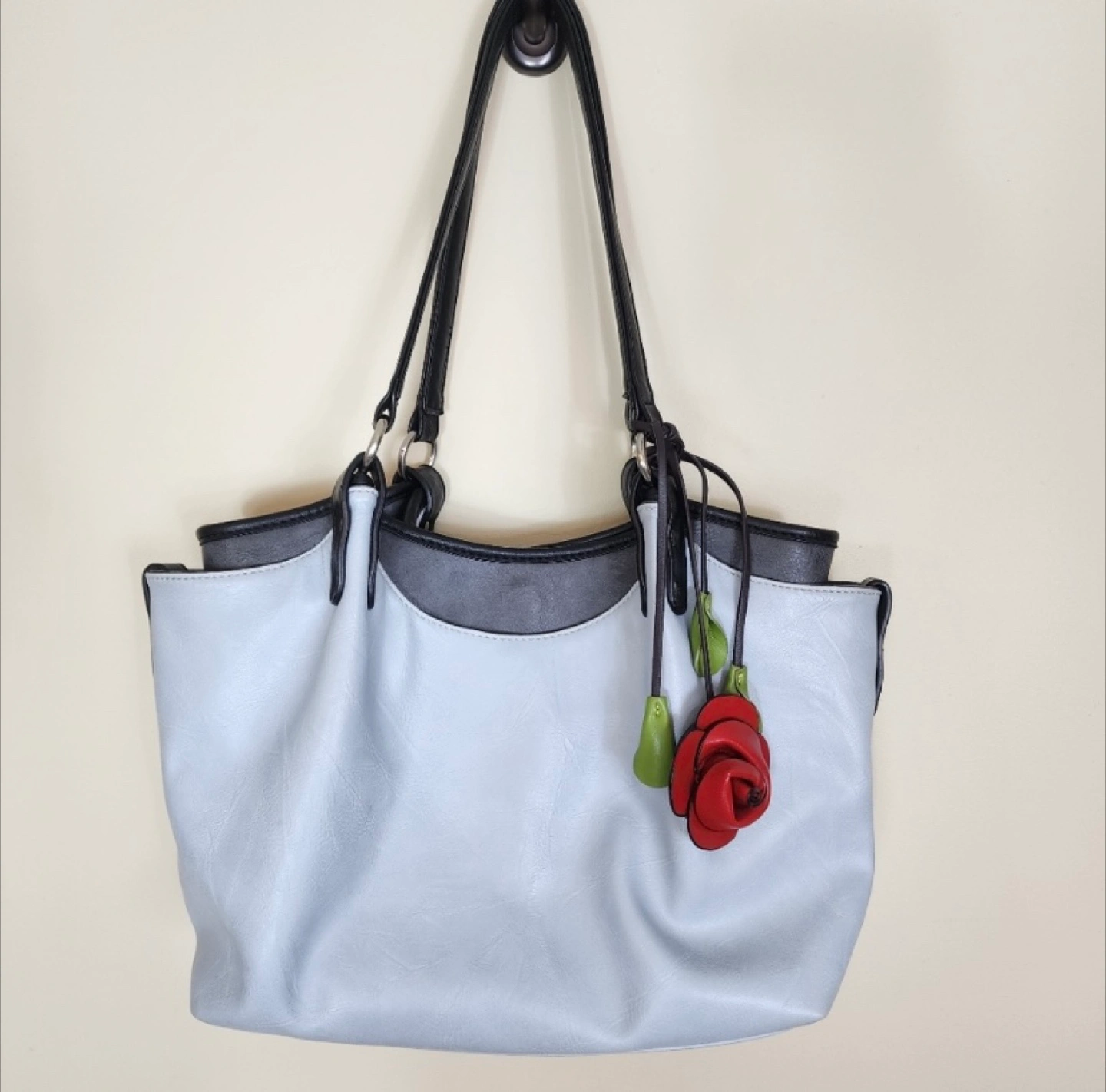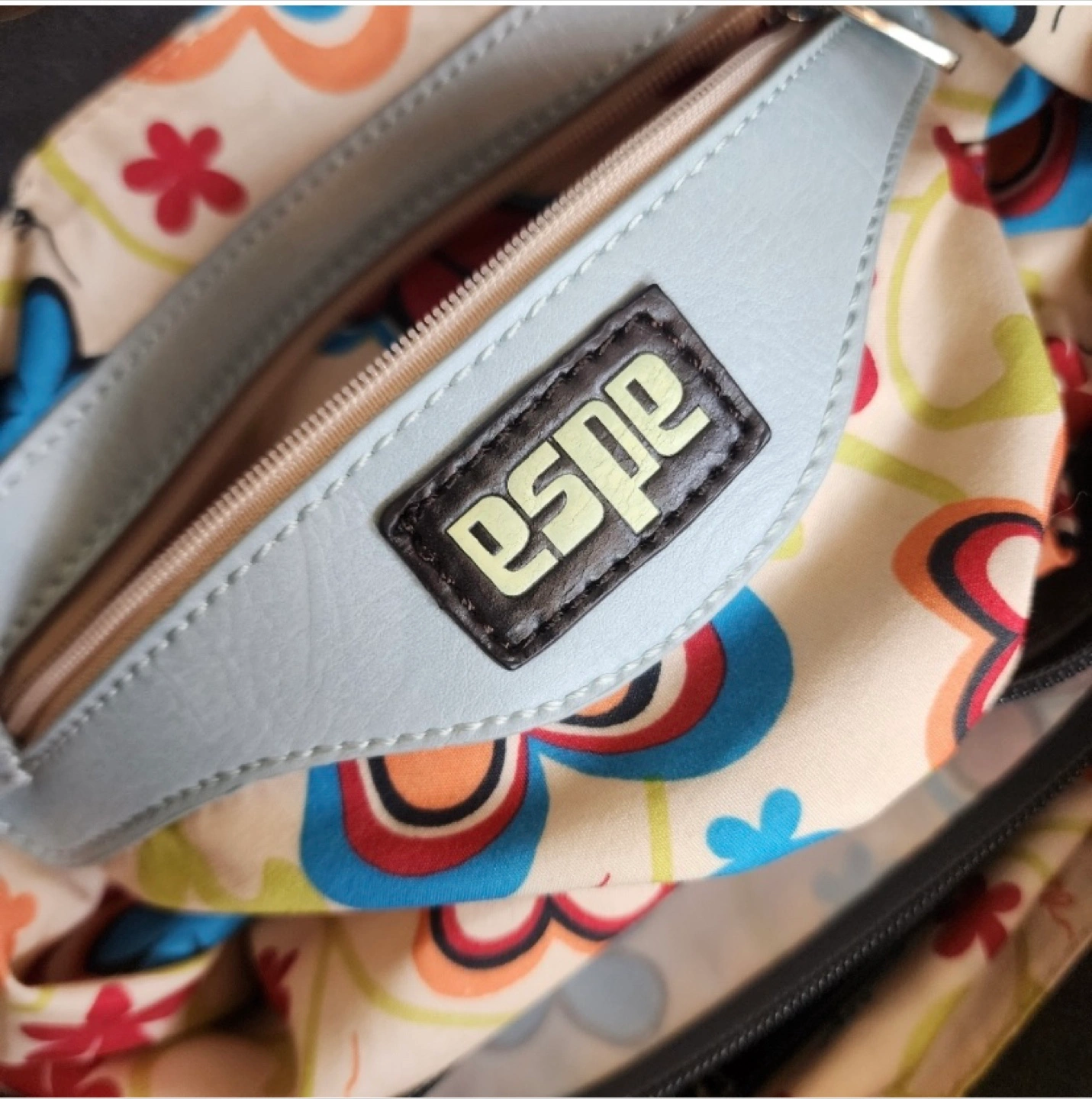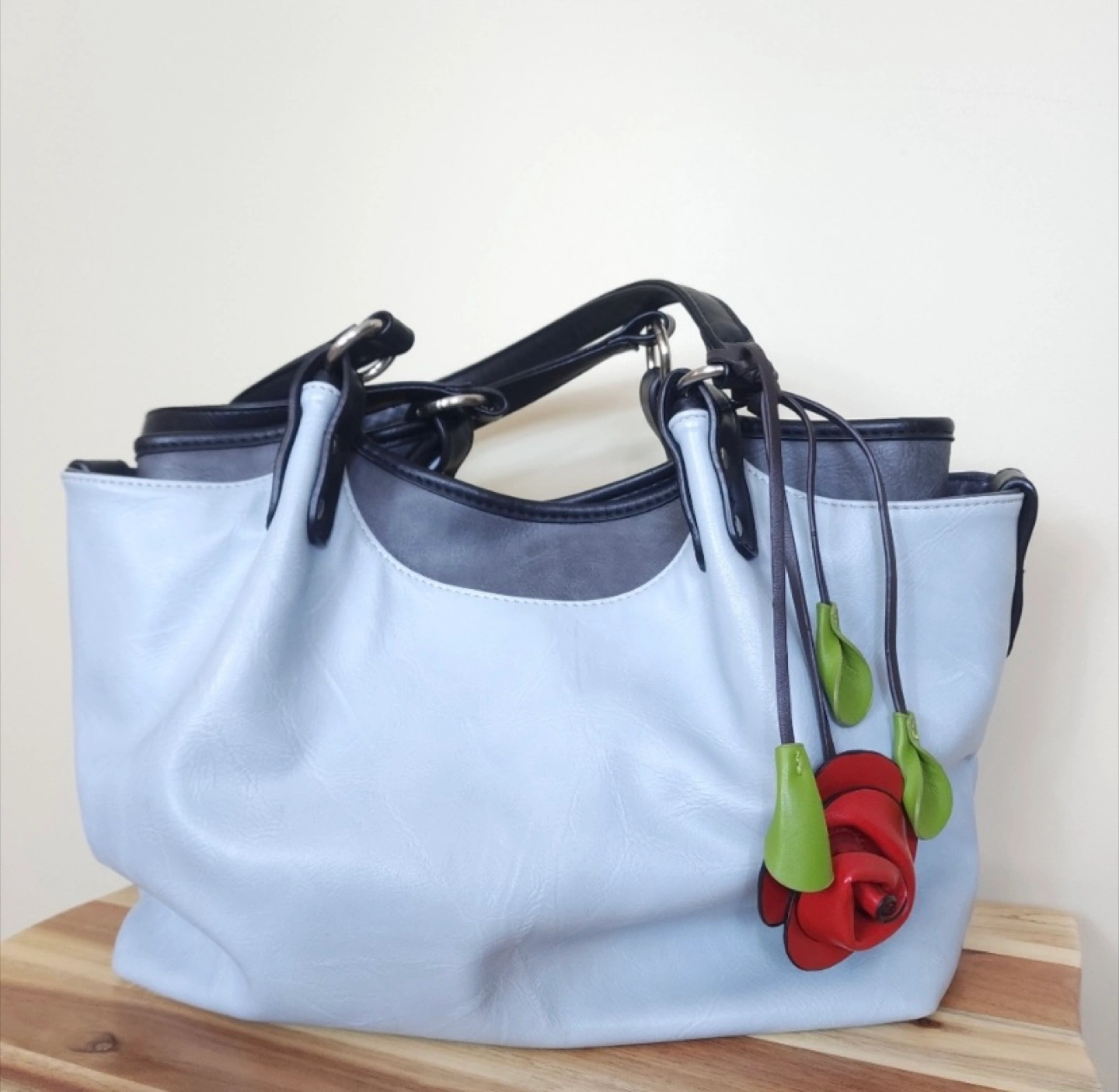 This is an Espe vegan leather tote bag featuring a unique rose detail, perfect for adding a touch of elegance to your outfit. The light blue exterior is complemented by black straps and a vibrant floral interior lining. Like new, no signs of wear.