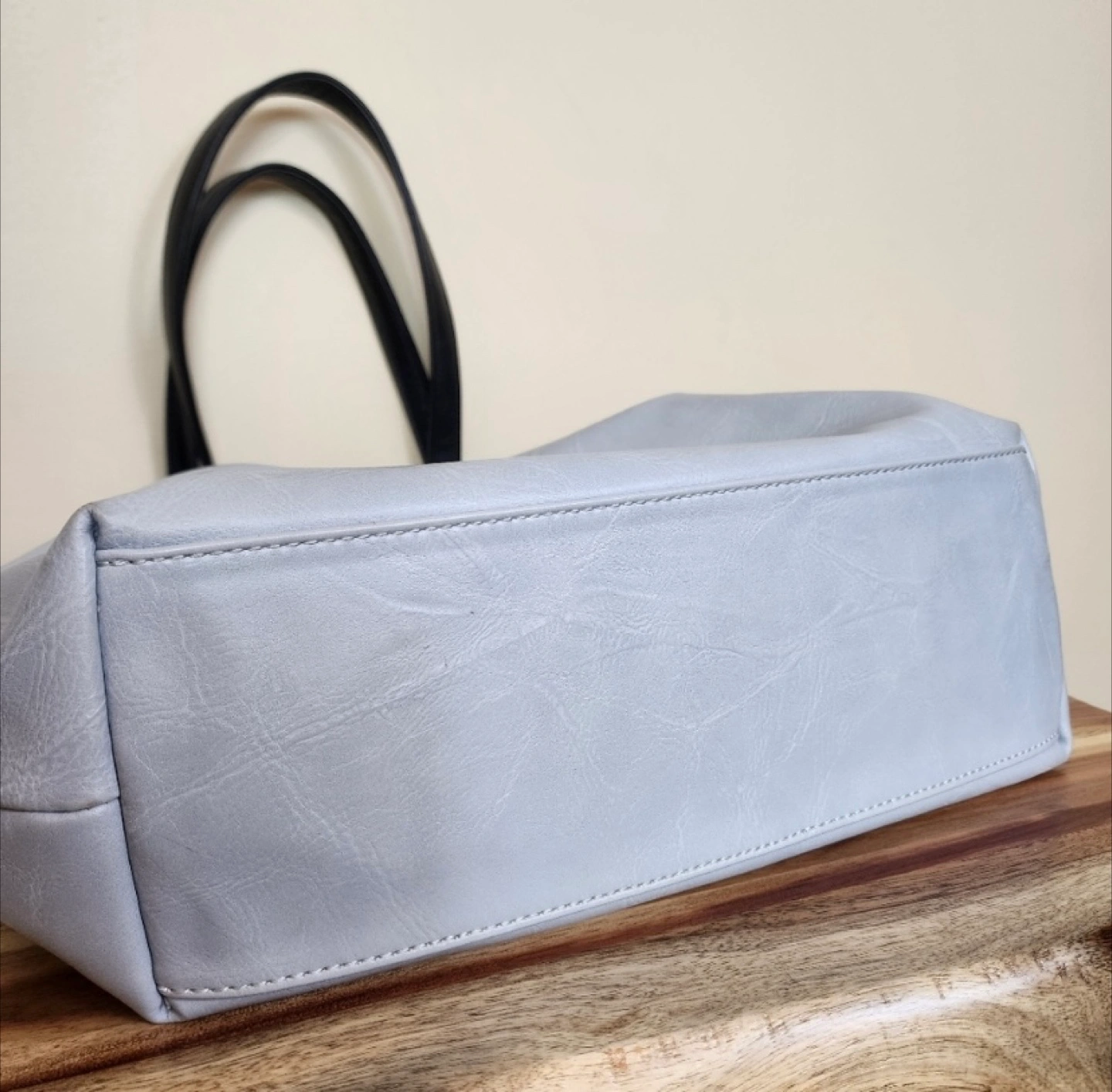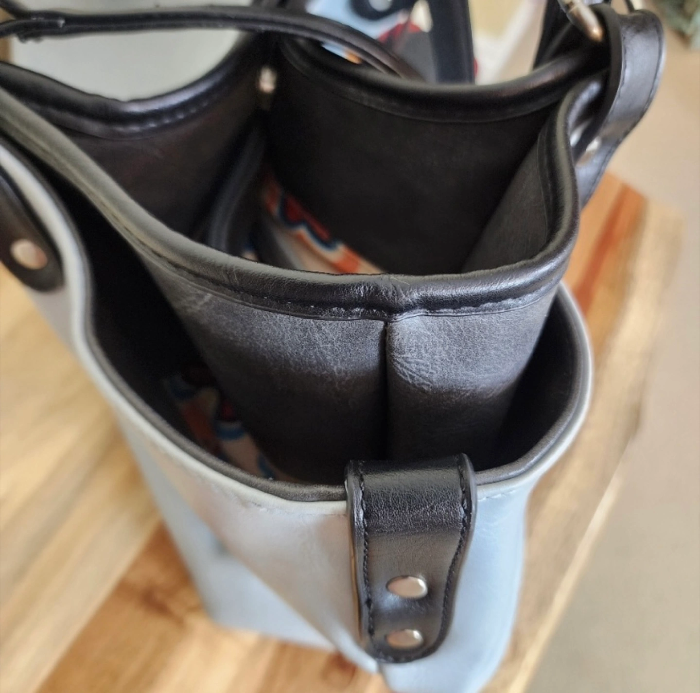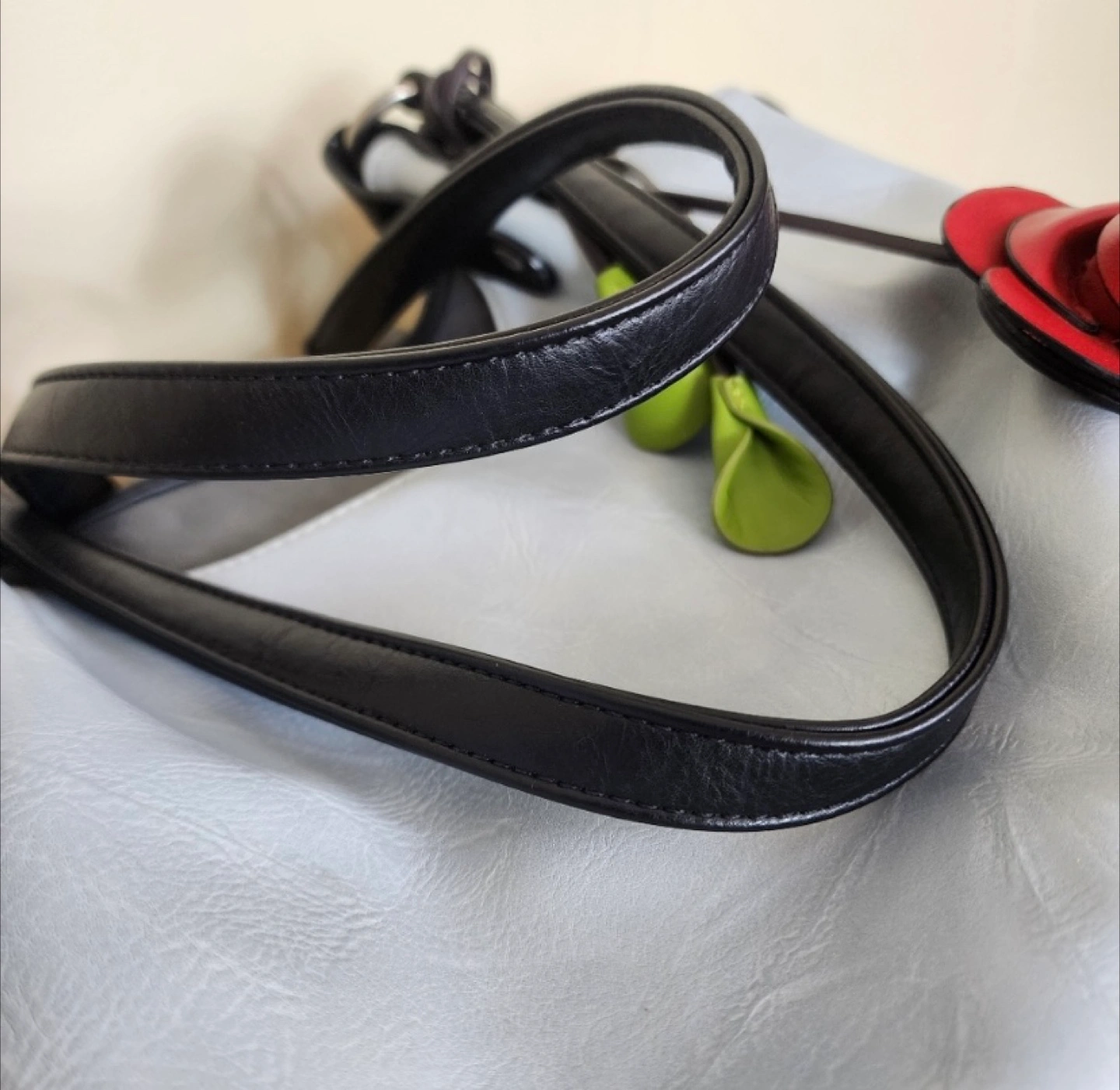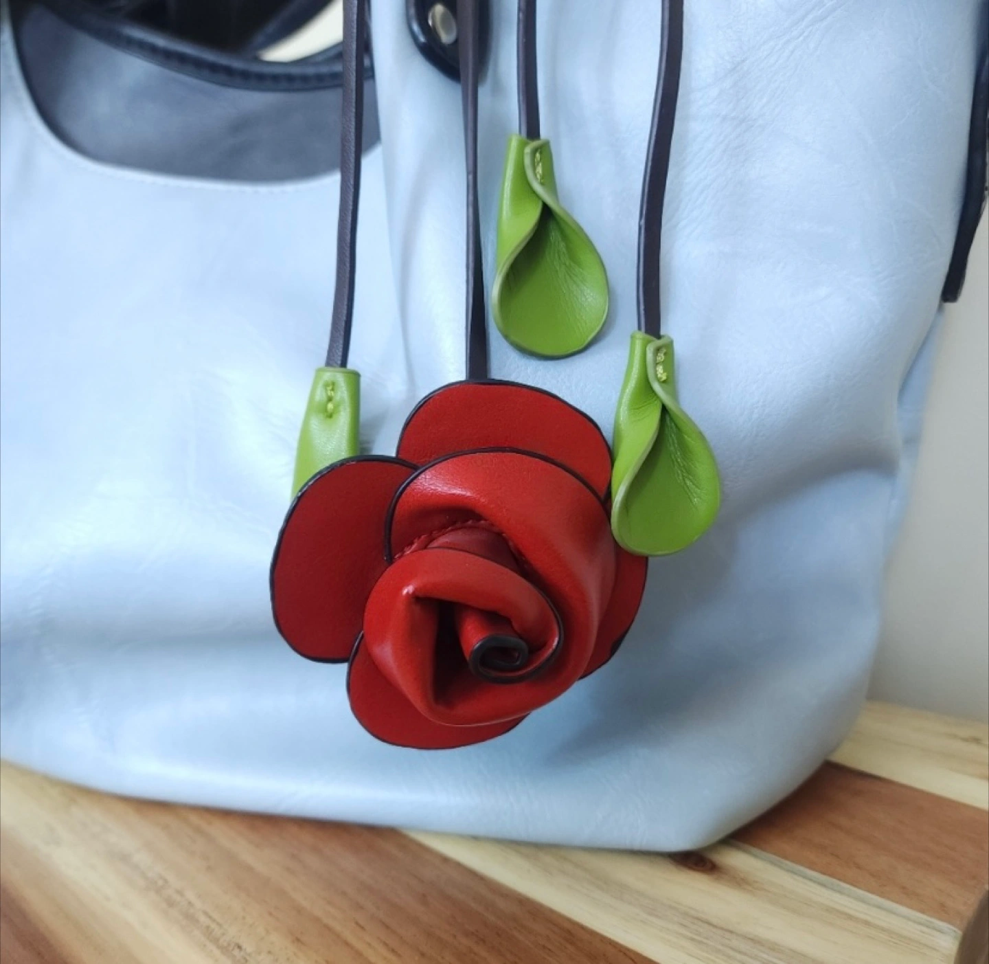 This is an Espe vegan leather tote bag featuring a unique rose detail, perfect for adding a touch of elegance to your outfit. The light blue exterior is complemented by black straps and a vibrant floral interior lining. Like new, no signs of wear.