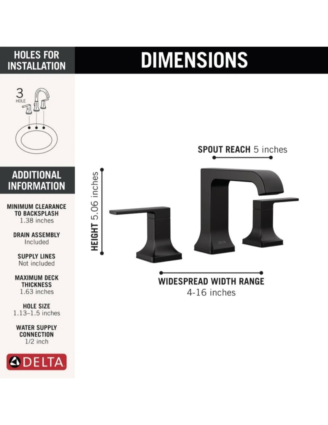 Selling a Delta Velum curved spout widespread bathroom faucet in matte black. It's designed for a 3-hole setup and includes a pop-up drain assembly. The spout reach is 5 inches, and the widespread width range is 4-16 inches. Easy to clean metal push pop-up drain!